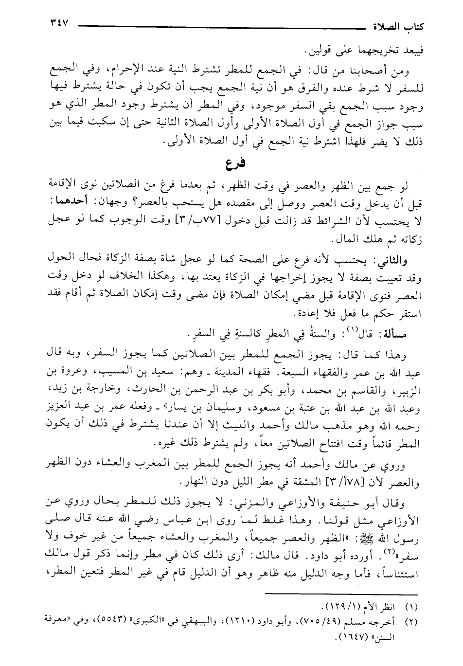 ومن أصحابنا من قال: في الجمع للمطر تشترط النية عند الإحرام، وفي الجمع للسفر لا شرط عنده والفرق هو أن نية الجمع يجب أن تكون في حالة يشترط فيها وجود سبب الجمع بقي السفر موجود، وفي المطر أن يشترط وجود المطر الذي هو سبب جواز الجمع في أول الصلاة الأولى وأول الصلاة الثانية حتى إن سكبت فيما بين ذلك لا يضر فلهذا اشترط نية الجمع في أول الصلاة الأولى.