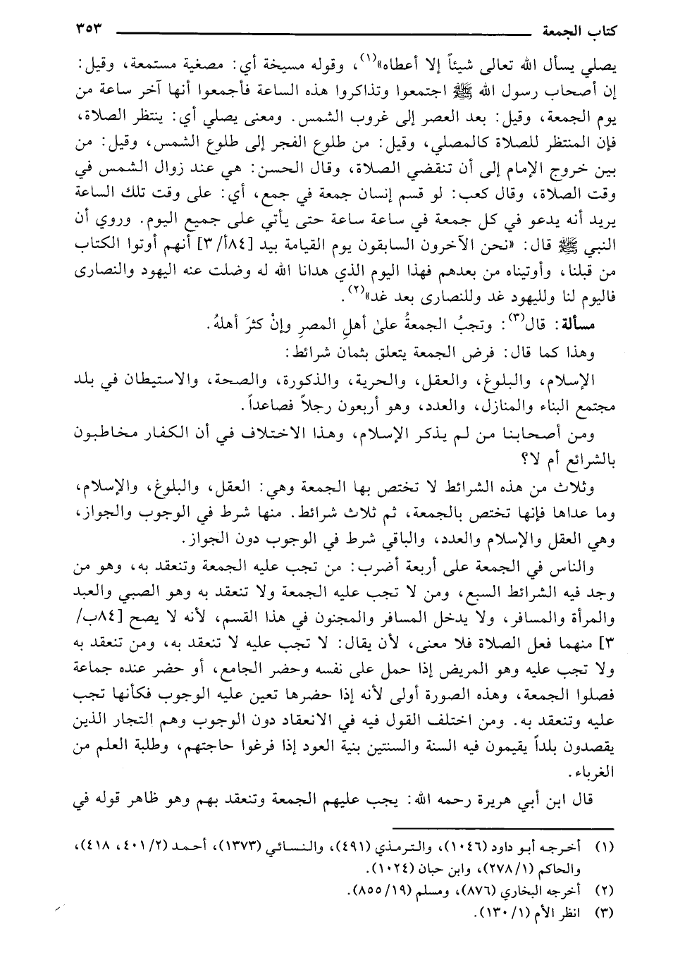 وثلاث من هذه الشرائط لا تختص بها الجمعة وهي: العقل، والبلوغ، والإسلام وما عداها فإنها تختص بالجمعة، ثم ثلاث شرائط. منها شرط في الوجوب والجواز، وهي العقل والإسلام والعدد، والباقي شرط في الوجوب دون الجواز.