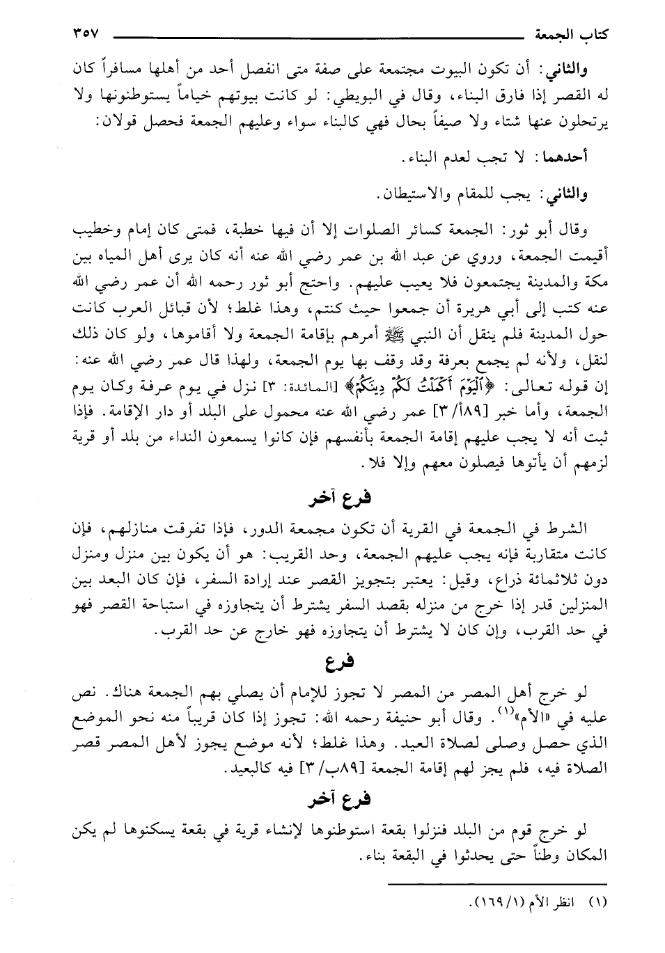 الثاني: أن تكون البيوت مجتمعة على صفة متى انفصل أحد من أهلها مسافراً كان له القصر إذا فارق البناء، وقال في البويطي: لو كانت بيوتهم خياماً يستوطنونها ولا يرتحلون عنها شتاءاً، ولا صيفاً بحال فهي كالبناء سواء وعليهم الجمعة فحصل قولان: