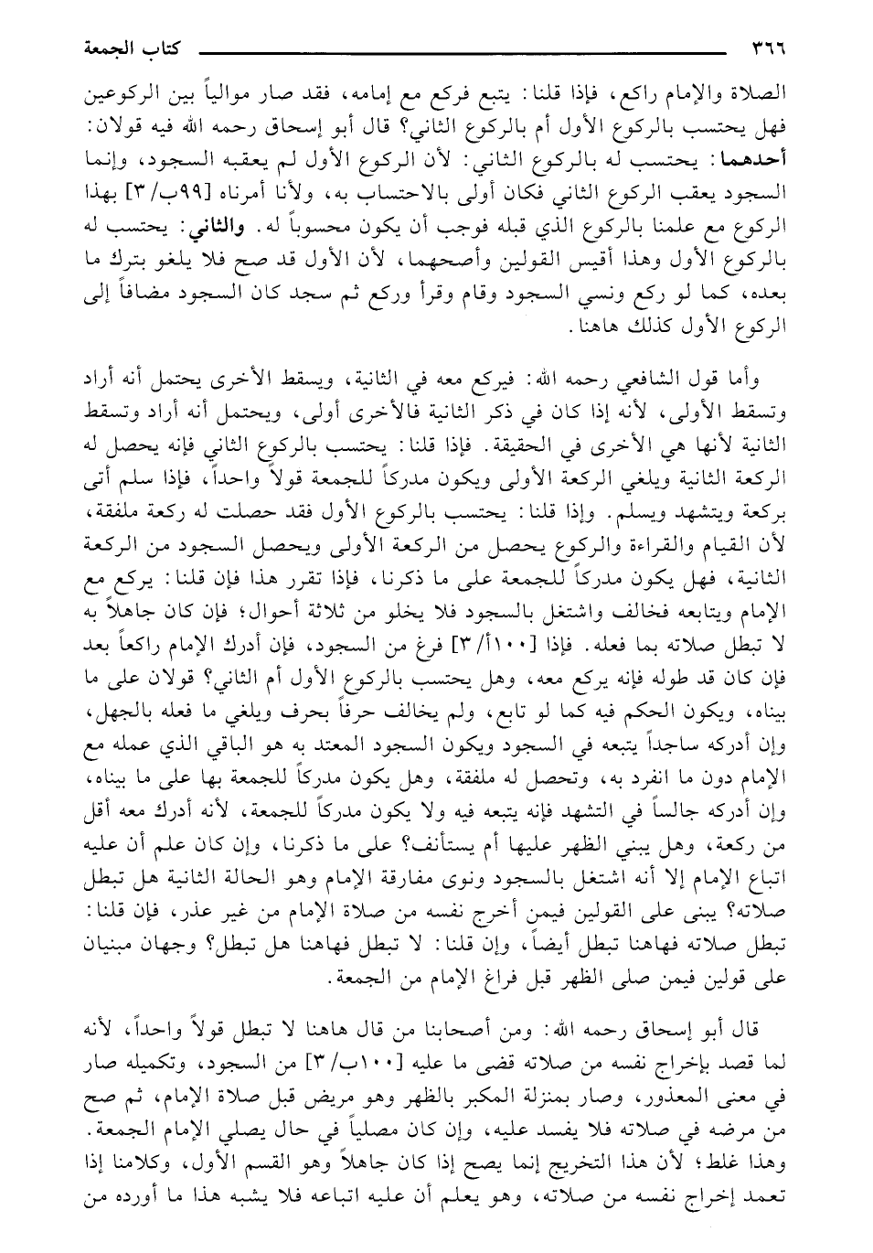 وأما قول الشافعي رحمه الله: فيركع معه في الثانية، وسيقط الأخرى يحتمل أنه أراد وتسقط الأولى، لأنه إذا كان في ذكر الثانية فالأخرى أولى، ويحتمل أنه أراد وتسقط الثانية لأنها هي الأخرى في الحقيقة. فإذا قلنا: يحتسب بالركوع الثاني فإنه يحصل له الركعة الثانية ويلغي الركعة الأولى ويكون مدركاً للجمعة قولاً واحداً، فإذا سلم أتى بركعة ويتشهد ويسلم. وإذا قلنا: يحتسب بالركوع الأول فقد حصلت له ركعة ملفقة، لأن القيام والقراءة والركوع يحصل من الركعة الأولى ويحصل السجود من الركعة الثانية، فهل يكون مدركا للجمعة على ما ذكرنا، فإذا تقرر هذا فإن قلنا: يركع مع الإمام ويتابعه فخالف واشتغل بالسجود فلا يخلو من ثلاثة أحوال؛ فإن كان جاهلاً به لا تبطل صلاته بما فعله. فإذا [100 أ/ 3] فرغ من السجود، فإن أدرك الإمام راكعا بعد فإن كان قد طوله فإنه يركع معه، وهل يحتسب بالركوع الأول أم الثاني؟ قولان على ما بيناه، ويكون الحكم فيه كما لو تابع، ولم يخالف حرفا بحرف ويلغي ما فعله بالجهل، وإن أدركه ساجداً يتبعه في السجود ويكون السجود المعتد به هو الباقي الذي عمله مع الإمام دون ما انفرد به، وتحصل له ملفقة، وهل يكون مدركاً للجمعة بها على ما بيناه، وإن أدركه جالساً في التشتهد فإنه يتبعه فيه ولا يكون مدكاً للجمعة، لأنه أدرك معه أقل من ركعة، وهل يبني الظهر عليها أم يستأنف؟ على ما ذكرنا، وإن كان علم أن عليه إتباع الإمام إلا أنه اشتغل بالسجود ونوى مفارقة الإمام وهو الحالة الثانية هل تبطل صلاته؟ يبنى على القولين فيمن أخرج نفسه من صلاة الإمام من غير عذر، فإن قلنا: تبطل صلاته فهاهنا تبطل أيضاً، وإن قلنا: لا تبطل فهاهنا هل تبطل؟ وجهان مبنيان على قولين فيمن صلى الظهر قبل فراغ الإمام من الجمعة.