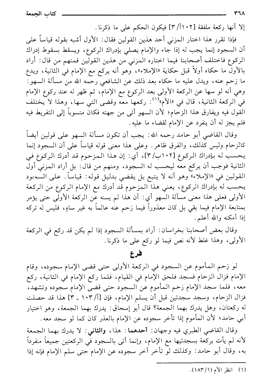 وقال القاضي أبو حامد رحمه الله: يجب أن تكون مسألة السهو على قولين أيضاً كالزحام وليس كذلك، والفرق ظاهر. وعلى هذا معنى قوله قياساً على أن السجود إنما يحسب له بإدراك الركوع [102 ب / 3]، أي: إن هذا المزحوم قد أدرك الركوع في الثانية فوجب أن يركع معه ليحسب له السجود، ومنهم من قال: بل أراد المزني أول القولين في "الإملاء" وهو أنه لا يتبع بل يقضي بدليل قوله: قياساً. على السجود يحسب له بإدراك الركوع، يعني هذا المزحوم قد أدرك مع الإمام الركوع من الركعة الأولى فعلى هذا معنى مسألة السهو أي: أن هذا لم يسنه عن الركعة الأولى حتى يؤمر بمتابعة الإمام فيما بقي بل كان معذوراً فيما زحم عنه عالماً به غير ساه، فليس له تركه إذا أمكنه والله أعلم.