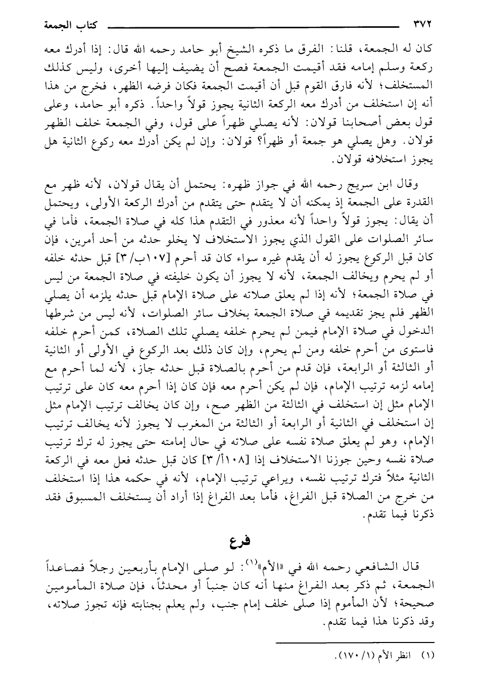 وقال ابن سريج رحمه الله في جواز ظهره: يحتمل أن يقال قولان، لأنه ظهر مع القدرة على الجمعة إذ يمكنه أن لا يتقدم حتى يتقدم من أدرك الركعة الأولى، ويحتمل أن يقال: يجوز قولاً واحداً لأنه معذور في التقدم هذا كله في صلاة الجمعة، فأما في سائر الصلوات على القول الذي يجوز الاستخلاف لا يخلو حدثه من أحد أمرين، فإن كان قبل الركوع يجوز له أن يقدم غيره سواء كان قد أحرم [107 ب/ 3] قبل حدثه خلفه أو لم يحرم ويخالف الجمعة، لأنه لا يجوز أن يكون خليفته في صلاة الجمعة من ليس في صلاة الجمعة؛ لأنه إذا لم يعلق صلاته على صلاة الإمام قبل حدثه يلزمه أن يصلي الظهر فلم يجز تقديمه في صلاة الجمعة بخلاف سائر الصلوات، لأنه ليس من شرطها الدخول في صلاة الإمام فيمن لم يحرم خلفه يصلي تلك الصلاة، كمن أحرم خلفه فاستوي من أحرم خلفه ومن لم يحرم، وإن كان ذلك بعد الركوع في الأولى أو الثانية أو الثالثة أو الرابعة، فإن قدم من أحرم بالصلاة قبل حدثه جاز، لأنه لما أحرم مع إمامه لزمه ترتيب الإمام، فإن لم يكن أحرم معه فإن كان إذا أحرم معه كان على ترتيب الإمام مثل إن استخلف في الثالثة من الظهر صح، وإن كان يخالف ترتيب الإمام مثل إن استخلف في الثانية أو الرابعة أو الثالثة من المغرب لا يجوز لأنه يخالف ترتيب الإمام، وهو لم يعلق صلاة نفسه على صلاته في حال إمامته حتى يجوز له ترك ترتيب صلاة نفسه وحين جوزنا الاستخلاف إذا [108 أ/ 3] كان قبل حدثه فعل معه في الركعة الثانية مثلاً فترك ترتيب نفسه، ويراعي ترتيب الإمام، لأنه في حكمه هذا إذا استخلف من خرج من الصلاة قبل الفراغ، فأما بعد الفراغ إذا أراد أن يستخلف المسبوق فقد ذكرنا فيما تقدم.