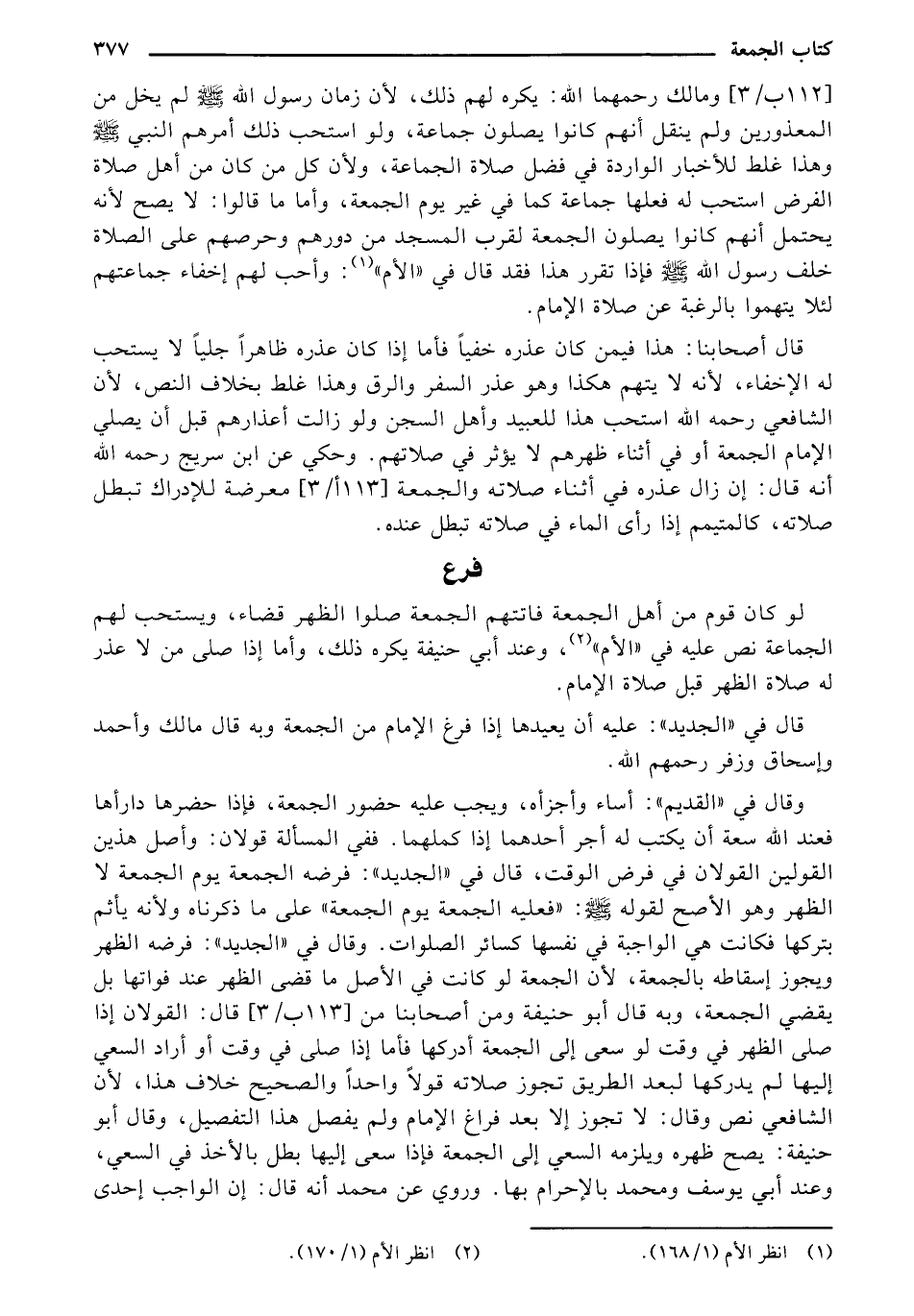 وقال في "القديم" أساء وأجزأه، ويجب عليه حضور الجمعة، فإذا حضرها دارأها فعند الله سعة أن يكتب له أجر أحدهما إذا كملهما. ففي المسألة قولان: وأصل هذين القولين القولان في فرض الوقت، قال في "الجديد": فرضه الجمعة يوم الجمعة لا الظهر وهو الأصح لقوله - صلى الله عليه وسلم -: "فعليه الجمعة يوم الجمعة" على ما ذكرناه ولأنه يأثم بتركها فكانت هي الواجبة في نفسها كسائر الصلوات. وقال في "الجديد": فرضه الظهر ويجوز إسقاطه بالجمعة، لأن الجمعة لو كانت في الأصل ما قضى الظهر عنا فواتها بل يقضي الجمعة، وبه قال أبو حنيفة ومن أصحابنا من [113 ب/ 3] قال: القولان إذا صلى الظهر في وقت لو سعى إلى الجمعة أدركها فأما إذا صلى في وقت أو أراد السعي إليها لم يدركها لبعد الطريق تجوز صلاته قولاً واحداً والصحيح خلاف هذا، لأن الشافعي نص وقال: لا تجوز إلا بعد فراغ الإمام ولم يفصل هذا التفصيل، وقال أبو حنيفة: يصح ظهره ويلزمه السعي إلى الجمعة فإذا سعى إليها بطل بالأخذ في السعي، وعند أبي يوسف ومحمد بالإحرام بها. وروي عن محمد أنه قال: إن الواجب إحدى