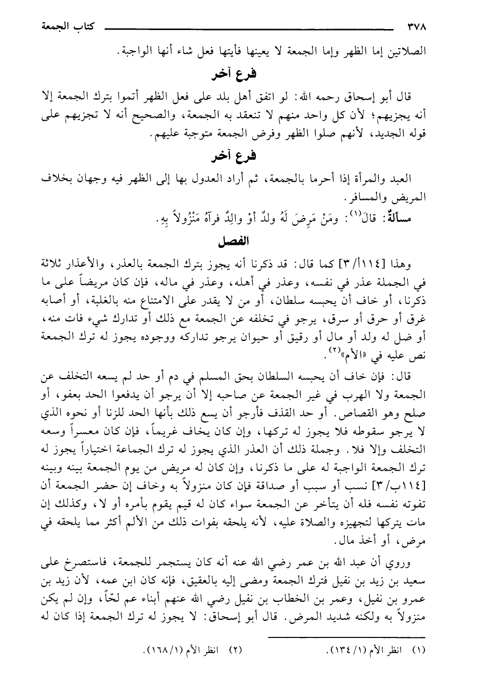 قال: فإن خاف أن يحبسه السلطان بحق المسلم في دم أو حد لم يسعه التخلف عن الجمعة ولا الهرب في غير الجمعة عن صاحبه إلا أن يرجو أن يدفعوا الحد بعفو، أو صلح وهو القصاص. أو حد القذف فأرجو أن يسع ذلك بأنها الحد للزنا أو نحوه الذي لا يرجو سقوطه فلا يجوز له تركها، وان كان يخاف غريماً، فإن كان معسرا وسعه التخلف وإلا فلا. وجملة ذلك أن العذر الذي يجوز له ترك الجماعة اختياراً يجوز له ترك الجمعة الواجبة له على ما ذكرنا، وإن كان له مريض من يوم الجمعة بينه وبينه [114 ب/ 3] نسب أو سبب أو صداقة فإن كان منزولاً به وخاف إن حضر الجمعة أن تفوته نفسه فله أن يتأخر عن الجمعة سواء كان له قيم يقوم بأمره أو لا، وكذلك إن مات يتركها لتجهيزه والصلاة عليه، لأنه يلحقه بفوات ذلك من الألم أكثر مما يلحقه في مرض، أو أخذ مال.