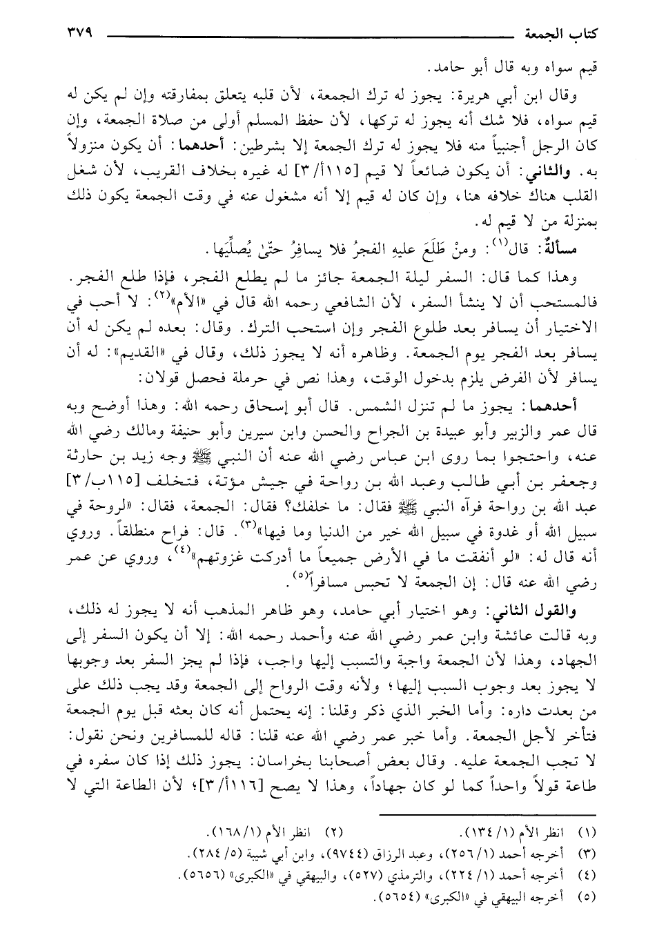 أحدهما: يجوز ما لم تنزل الشمس. قال أبو إسحاق رحمه الله: وهذا أوضح وبه قال عمر والزبير وأبو عبيدة بن الجراح والحسن وابن سيرين وأبو حنيفة ومالك رضي الله عنه، واحتجوا بما روى ابن عباس رضي الله عنه أن النبي - صلى الله عليه وسلم - وجه زيد بن حارثة وجعفر بن أبي طالب وعبد الله بن وواحة في جيش مؤتة، فتخلف [115 ب/3] عبد الله بن رواحة فرآه النبي - صلى الله عليه وسلم - فقال: ما خلفك؟ فقال: الجمعة، فقال: "لروحة في سبيل الله أو غدوة في سبيل الله خير من الدنيا وما فيها". قال: فراح منطلقاً. وروي أنه قال له: "لو أنفقت ما في الأرض جميعاً ما أدركت غزوتهم" وروي عن عمر رضي الله عنه قال: إن الجمعة لا تحبس مسافراً.