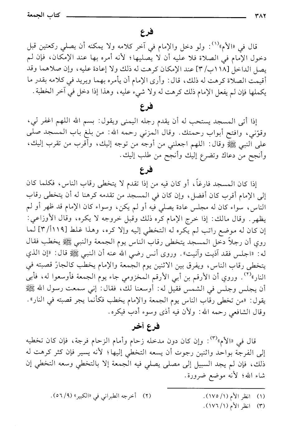 إذا كان المسجد فارغاً، أو كان فيه من إذا تقام لا يتخطى رقاب الناس، فكلما كان إلى الإمام أقرب كان أفضل، وإن كان في المسجد من تقدمه كرهنا له أن يتخطى رقاب الناس، سواء كان له مجلس عادة يصلي فيه أو لم يكن، وسواء كان الإمام قد ظهر أو لم يظهر. وقال مالك: إذا خرج الإمام كره ذلك وقبل خروجه لا يكره، وقال الأوزاعي: إن كان له موضع راتب لم يكره له التخطي إليه وإلا كره، وهذا غلط [119 أ/ 3] لما روي أن رجلاً دخل المسجد يتخطى رقاب الناس يوم الجمعة والنبي - صلى الله عليه وسلم - يخطب فقال له: "اجلس فقد آذيت وآنيت". وروى أنس رضي الله عنه أن النبي - صلى الله عليه وسلم - قال: "إن الذي يتخطى رقاب الناس، ويفرق بين الاثنين يوم الجمعة والإمام يخطب كالجار قصبته في النار". وروي أن الأرقم بن أبي الأرقم المخزومي جاء يوم الجمعة فأوسعوا له، فأبى أن يجلس وجلس في الشمس فقيل له: أوسعنا لك، فقال: إني سمعت رسول الله - صلى الله عليه وسلم - يقول: "من تخطى رقاب الناس يوم الجمعة والإمام يخطب فكأنما يجر قصبته في النار".