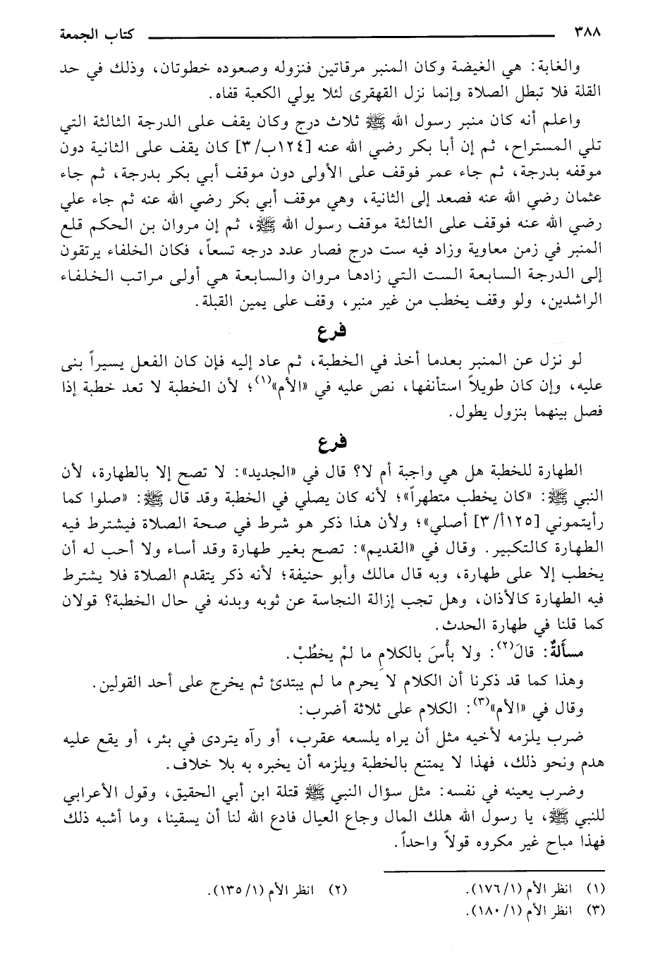 واعلم أنه كان منبر رسول الله - صلى الله عليه وسلم - ثلاث درج وكان يقف على الدرجة الثالثة التي تلي المستراح، ثم إن أبا بكر رضي الله عنه [124 ب/ 3] كان يقف على الثانية دون موقفه بدرجة، ثم جاء عمر فوقف على الأولى دون موقف أبي بكر بدرجة، ثم جاء عثمان رضي الله عنه فصعد إلى الثانيةء وهي موقف أبي بكر رضي الله عنه ثم جاء علي رضي الله عنه فوقف على الثالثة موقف رسول الله - صلى الله عليه وسلم - ثم إن مروان بن الحكم قلع المنبر في زمن معاوية وزاد فيه ست درج فصار عدد درجه تسعاً، فكان الخلفاء يرتقون إلى الدرجة السابعة الست التي زادها مروان والسابعة هي أولى مراتب الخلفاء الراشدين، ولو وقف يخطب من غير منبر، وقف على يمين القبلة.