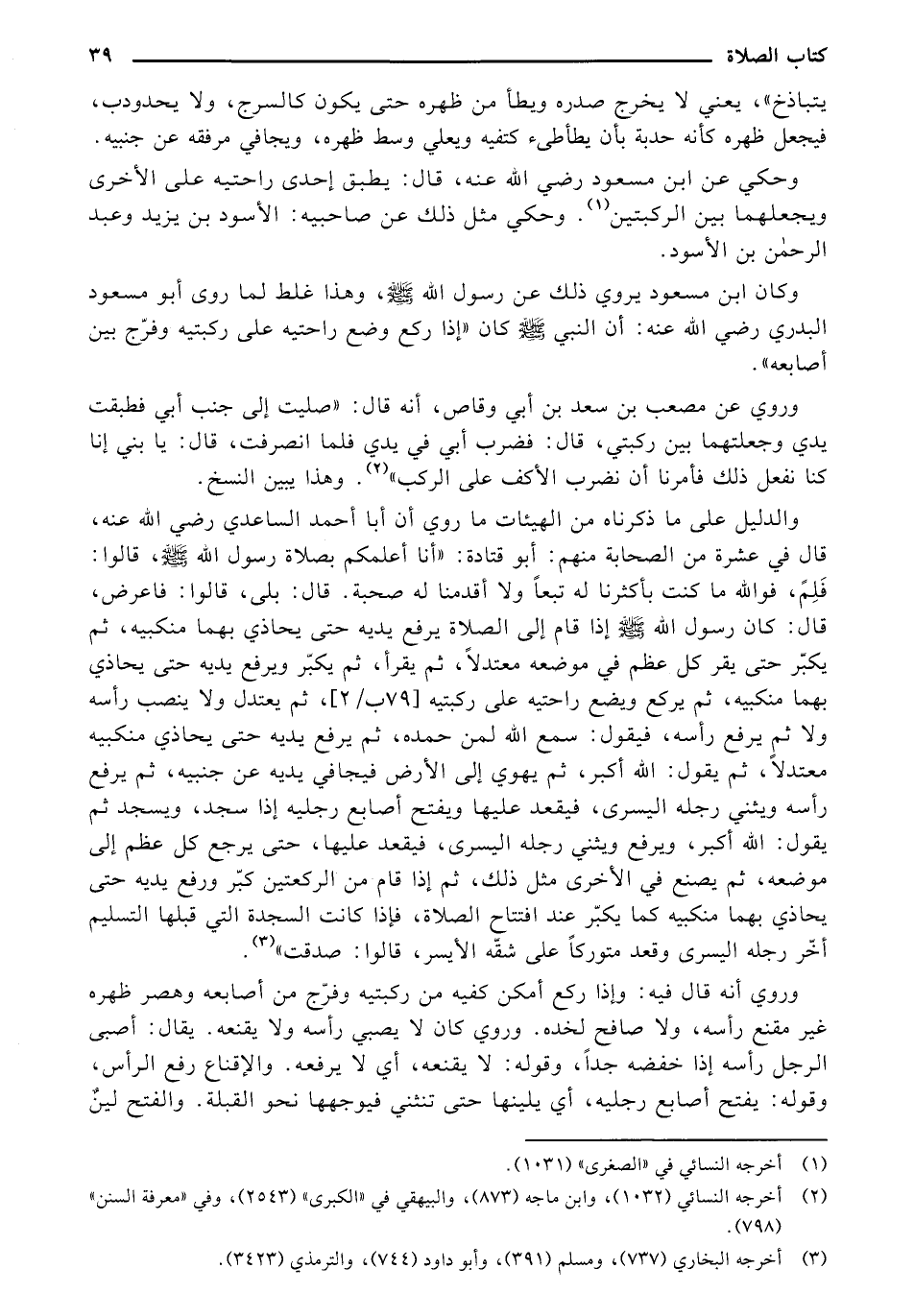 والدليل على ما ذكرناه من الهيئات ما روي أن أبا أحمد الساعدي رضي الله عنه، قال في عشرة من الصحابة منهم: أبو قتادة: (أنا أعلمكم بصلاةَ رسول الله - صلى الله عليه وسلم -، قالوا: فلم، فو الله ما كنت بأكثرنا له تبعًا ولا أقدمنا له صّحبة. قال: بلى، قالوا: فاعرض، قال: كان رسول الله - صلى الله عليه وسلم -. إذا قام إلى الصلاةَ يرفع يديه حتى يحاذي بهما منكبيه، ثم يكبرّ حتى يقر كل عظم في موضعه معتدلًا، ثم يقرأ، ثم يكبرّ ويرفع يديه حتى يحاذي بهما منكبيه، ثم يركع ويضع راحتيه على ركبتيه [79 ب/2]، ثم يعتدل ولا ينصب رأسه ولا ثم يرفع رأسه، فيقول: سمع الله لمن حمده، ثم يرفع يديه حتى يحاذي منكبيه معتدلًا، ثم يقول: الله أكبرّ، ثم يهوي إلى الأرض فيجافي يديه عن جنبيه، ثم يرفع رأسه ويثني رجله اليسرى، فيقعد عليها ويفتح أصابع رجليه إذا سجد، ويسجد ثم يقول: الله أكبرّ، ويرفع ويثني رجله اليسرى، فيقعد عليها، حتى يرجع كل عظم إلى موضعه، ثم يصنع في الأخرى مثل ذلك، ثم إذا قام من الركعتين كبرّ ورفع يديه حتى يحاذي بهما منكبيه كما يكبرّ عند افتتاح الصلاةَ، فإذا كانت السجدة التي قبلها التسليم أخر رجله اليسرى وقعد متوركاً على شقّه الأيسر، قالوا: صدقت).