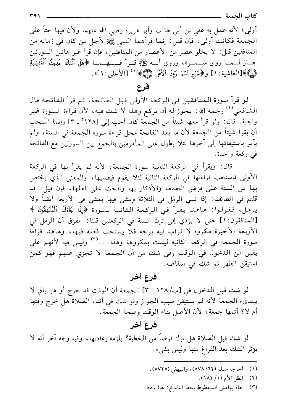 لو قرأ سورة المنافقين ني الركعة الأولى قبل الفاتحة، ثم قرأ الفاتحة قال الشافعي رحمه الله: يجوز له أن يركع وهذا لا شك فيه، لأن قراءة السورة غير واجبة. قال: ولو قرأ معها شيئاً من الجمعة كان أحب إلي [128 أ/ 3] وإنما استحب أن يقرأ شيئاً من الجمعة لأن ما بعد الفاتحة محل قراءة سورة الجمعة في السنة، ولم يأمر باستيفائها إلى آخرها لئلا يطول على المأمومين بالجمع بين السورتين مع الفاتحة في ركعة واحدة.