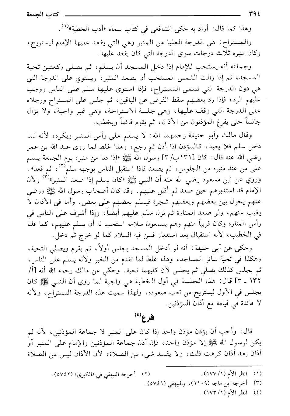 وروي عن ابن مسعود رضي الله عنه أن النبي - صلى الله عليه وسلم - "كان يسلم إذا صعد المنبر" ولان الإمام قد استدبرهم حين صعد ثم أقبل عليهم. وقد كان أصحاب رسول الله - صلى الله عليه وسلم - ورضي عنهم يحول بين بعضهم وبعضهم شجرة فيسلم بعضهم على بعض. وأما في الأذان لا يغيب عنهم، ولو صعد المنارة ثم نزل سلم عليهم أيضاً، وإذا أشرف على الناس في رأس المنارة وكان قريباً منهم وهم يسمعون سلامه استحب له أن يسلم عليهم، كما قلنا في الخطيب، لأنه استقبال بعد استدبار فسن فيه السلام كما لو خرج ثم دخل.