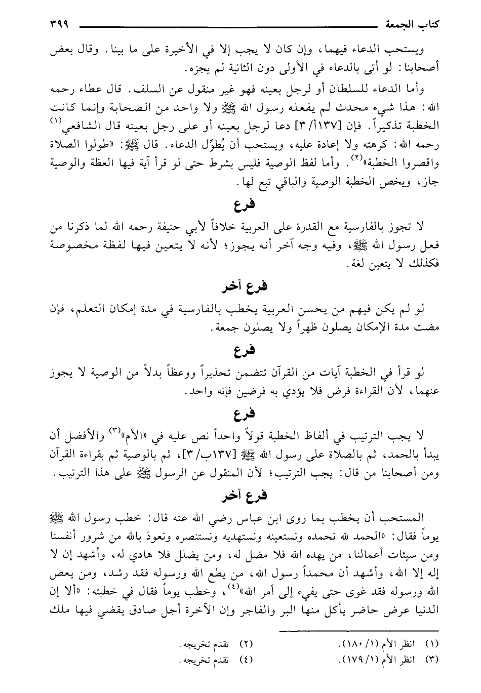 وأما الدعاء للسلطان أو لرجل بعينه فهو غير منقول عن السلف. قال عطاء رحمه الله: هذا شيء محدث لم يفعله رسول الله - صلى الله عليه وسلم - ولا واحد من الصحابة وإنما كانت الخطبة تذكيراً. فإن [137 أ/ 3] دعا لرجل بعينه أو على رجل بعينه قال الشافعي رحمه الله: كرهته ولا إعادة عليه، ويستحب أن يطول الدعاء. قال - صلى الله عليه وسلم -: "طولوا الصلاة واقصروا الخطبة". وأما لفظ الوصية فليس بشرط حتى لو قرأ آية فيها العظة والوصية جاز، ويخص الخطبة الوصية والباقي تبع لها.