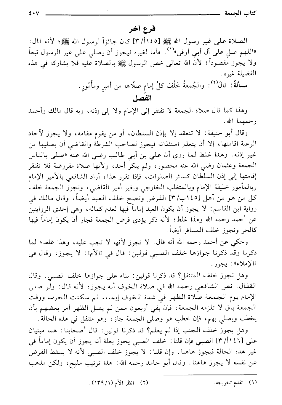 الصلاة على غير رسول الله - صلى الله عليه وسلم -[145 أ/ 3] كان جائزاً لرسول الله - صلى الله عليه وسلم -: لأنه قال: "اللهم صل على آل أبي أوفى". فأما لغيره فيجوز أن يصلي على غير الرسول تبعاً ولا يجوز مقصوداً: لأن الله تعالى خص الرسول - صلى الله عليه وسلم - بالصلاة عليه فلا يشاركه في هذه الفضيلة غيره.