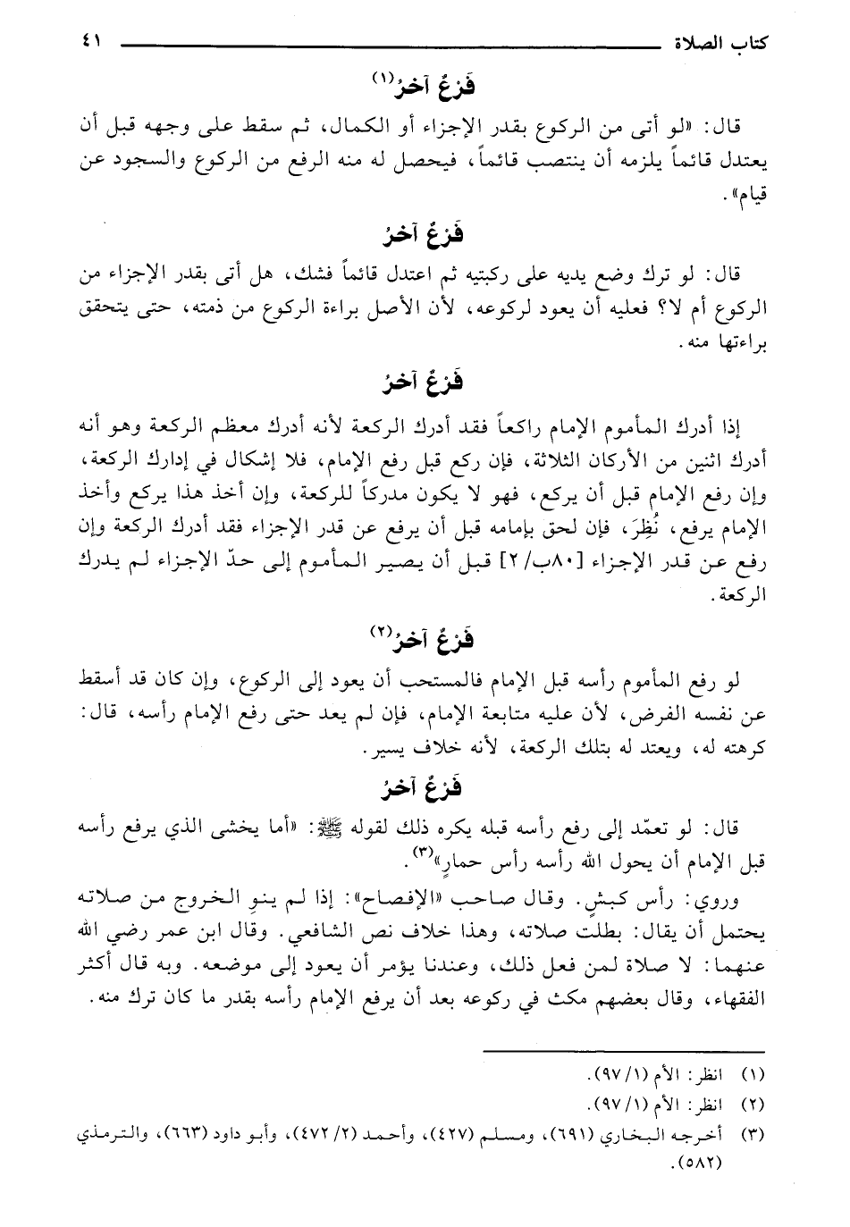 وروي: رأس كبٍش. وقال صاحب (الإفصاح): إذا لم ينِو الخروج من صلاته يحتمل أن يقال: بطلت صلاته، وهذا خلاف نص الشافعي. وقال ابن عمر رضي الله عنه: لا صلاةَ لمن فعل ذلك، وعندنا يؤمر أن يعود إلى موضعه 0 وبه قال أكثر الفقهاء، وقال بعضهم مكث في ركوعه بعد أن يرفع الإمام رأسه بقدر ما كان ترك منه.