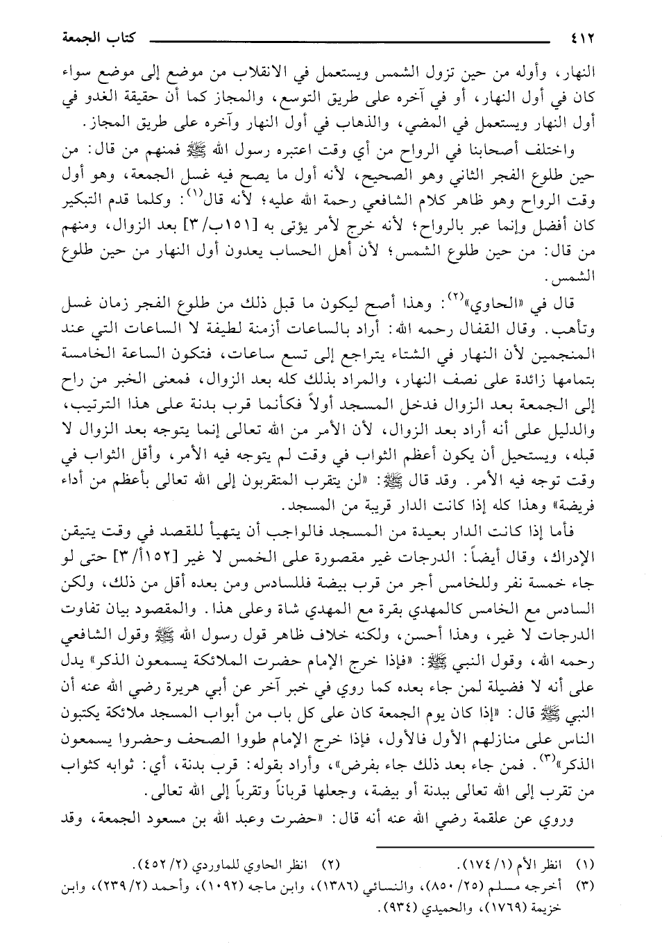واختلف أصحابنا في الرواح من أي وقت اعتبره رسول الله - صلى الله عليه وسلم - فمنهم من قال: من حين طلوع الفجر الثاني وهو الصحيح، لأنه أول ما يصح فيه غسل الجمعة، وهو أول وقت الرواح وهو ظاهر كلام الشافعي رحمة الله عليه؛ لأنه قال: وكلما قدم التبكير كان أفضل وإنما عبر بالرواح؛ لأنه خرج لأمر يؤتى به [151 ب/ 3] بعد الزوال، ومنهم من قال: من حين طلوع الشمس؛ لأن أهل الحساب يعدون أول النهار من حين طلوع الشمس.