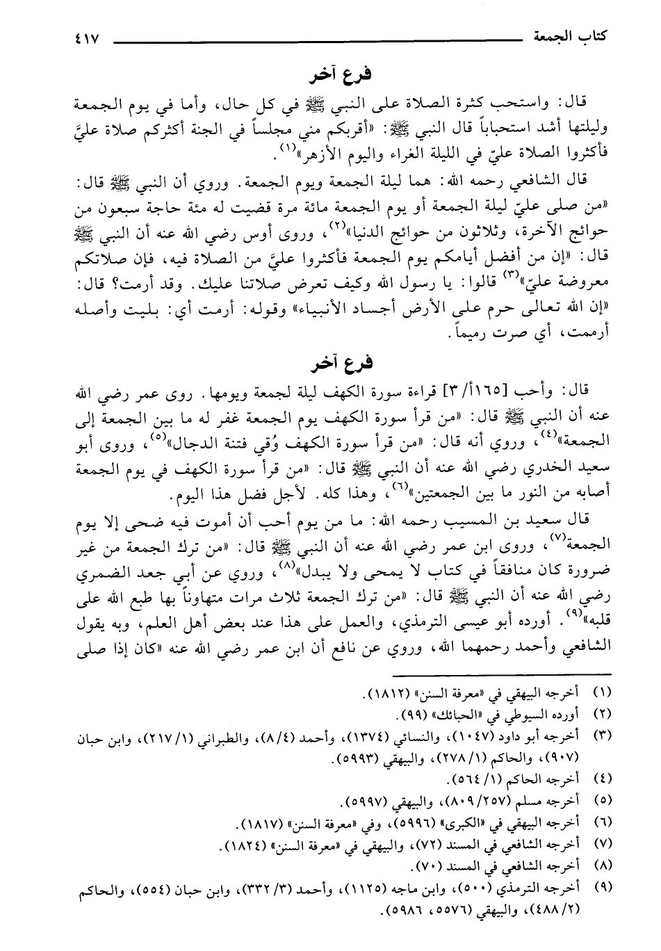 قال: واستحب كثرة الصلاة على النبي - صلى الله عليه وسلم - في كل حال، وأما في يوم الجمعة وليلتها أشد استحباباً قال النبي - صلى الله عليه وسلم -: "أقربكم مني مجلساً في الجنة أكثركم صلاة عليّ فأكثروا الصلاة عليّ في الليلة الغراء واليوم الأزهر".