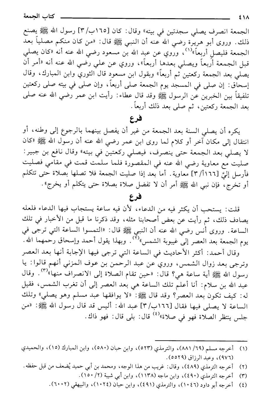 الجمعة انصرف يصلي سجدتين في بيته" وقال: كان [165 ب/ 3] رسول الله - صلى الله عليه وسلم - يصنع ذلك. وروى أبو هريرة رضي الله عنه أن النبي - صلى الله عليه وسلم - قال: "من كان منكم مصلياً بعد الجمعة فليصل أربعاً"، وروي عن عبد الله بن مسعود رضي الله عنه أنه "كان يصلي قبل الجمعة أربعاً ويصلي بعدها أربعاً"، وروي عن علي رضي الله عنه أنه "أمر أن يصلي بعد الجمعة ركعتين ثم أربعاً" وبقول ابن مسعود قال الثوري وابن المبارك، وقال إسحاق: إن صلى في المسجد يوم الجمعة صلى أربعاً، وإن صلى في بيته صلى ركعتين تلفيقاً بين الخبرين عن الرسول - صلى الله عليه وسلم - وقد قال عطاء: رأيت ابن عمر رضي الله عنه صلى بعد الجمعة ركعتين، ثم صلى بعد ذلك أربعاً.