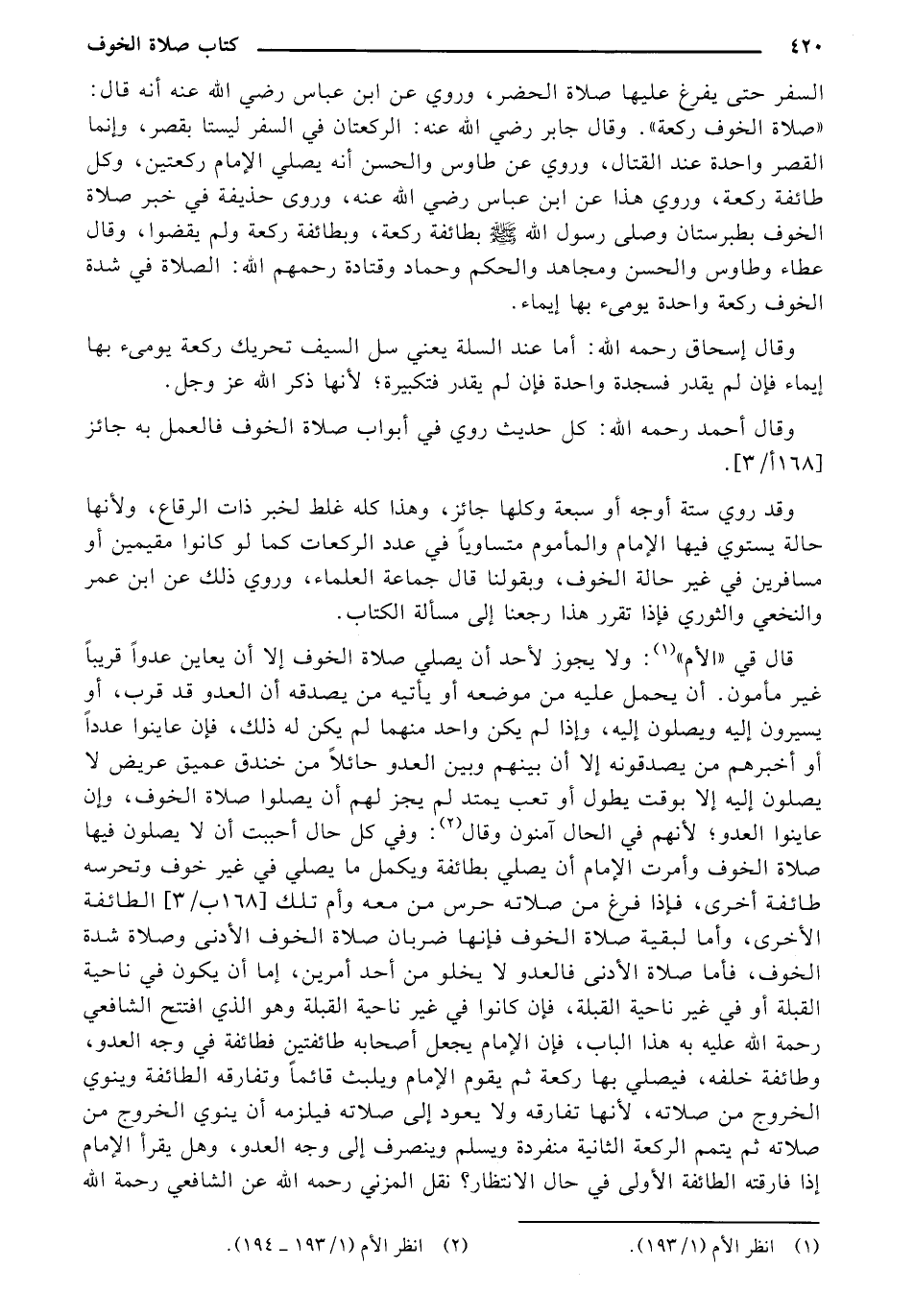 قال في "الأم": ولا يجوز لأحد أن يصلي صلاة الخوف إلا أن يعاين عدواً قريباً غير مأمون. أن يحمل عليه من موضعه أو يأتيه من يصدقه أن العدو قد قرب، أو يسيرون إليه ويصلون إليه، وإذا لم يكن واحد منهما لم يكن له ذلك، فإن عاينوا عدداً أو أخبرهم من يصدقونه إلا أن بينهم وبين العدو حائلاً من خناق عميق عريض لا يصلون إليه إلا بوقت يطول أو تعب يمتد لم يجز لهم أن يصلوا صلاة الخوف، وان عاينوا العدو؛ لأنهم في الحال آمنون وقال: وفي كل حال أحببت أن لا يصلون فيها صلاة الخوف وأمرت الإمام أن يصلي بطائفة ويكمل ما يصلي في غير خوف وتحرسه طائفة أخرى، فإذا فرغ من صلاته حرس من معه وأم تلك [168 ب/ 3] الطائفة الأخرى، وأما لبقية صلاة الخوف فإنها ضربان صلاة الخوف الأدنى وصلاة شدة الخوف، فأما صلاة الأدنى فالعدو لا يخلو من أحد أمرين، إما أن يكون في ناحية القبلة أو في غير ناحية القبلة، فإن كانوا في غير ناحية القبلة وهو الذي افتتح الشافعي رحمة الله عليه به هذا الباب، فإن الإمام يجعل أصحابه طائفتين فطائفة في وجه العدو، وطائفة خلفه، فيصلي بها ركعة ثم يقوم الإمام ويلبث قائماً وتفارقه الطائفة وينوي الخروج من صلاته، لأنها تفارقه ولا يعود إلى صلاته فيلزمه أن ينوي الخروج من صلاته ثم يتمم الركعة الثانية منفردة ويسلم وينصرف إلى وجه العدو، وهل يقرأ الإمام إذا فارقته الطائفة الأولى في حال الانتظار؟ نقل المزني رحمه الله عن الشافعي رحمة الله
