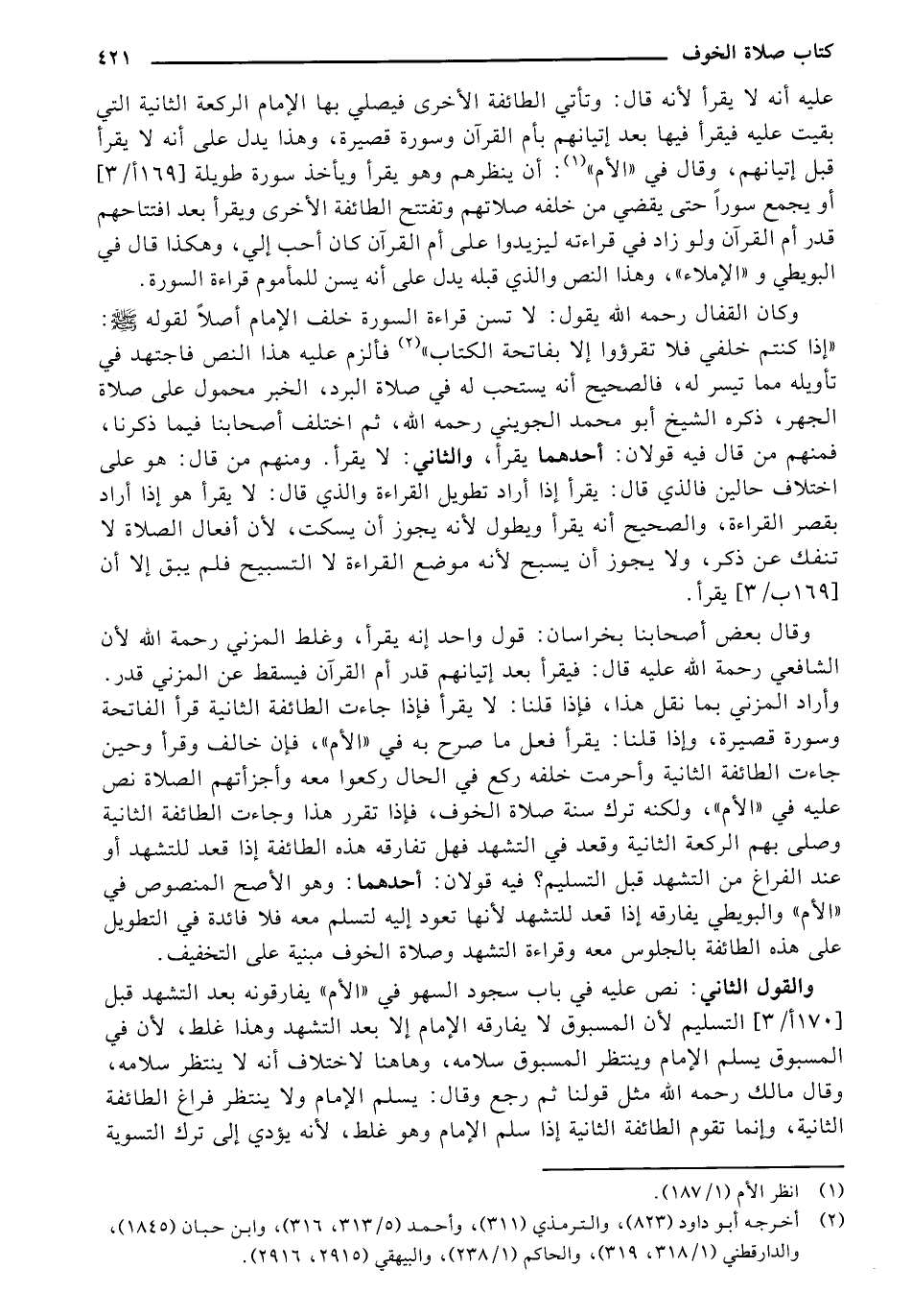 وقال بعض أصحابنا بخراسان: قول واحد إنه يقرأ، وغلط المزني رحمة الله لأن الشافعي رحمة الله عليه قال: فيقرأ بعد إتيانهم قدر أم القرآن فيسقط عن المزني قدر. وأراد المزني بما نقل هذا، فإذا قلنا: لا يقرأ فإذا جاءت الطائفة الثانية قرأ الفاتحة وسورة قصيرة، وإذا قلنا: يقرأ فعل ما مرح به في "الأم"، فإن خالف وقرأ وحين جاءت الطائفة الثانية وأحرمت خلفه ركع في الحال ركعوا معه وأجزأتهم الصلاة نص عليه في "الأم"، ولكنه ترك سنة صلاة الخوف، فإذا تقرر هذا وجاءت الطائفة الثانية وصلى بهم الركعة الثانية وقعد في التشهد فهل تفارقه هذه الطائفة إذا قعد للتشهد أو عند الفراغ من التشهد قبل التسليم؟ فيه قولان: أحدهما: وهو الأصح المنصوص في "الأم" والبويطي يفارقه إذا قعد للتشهد لأنها تعود إليه لتسلم معه فلا فائدة في التطويل على هذه الطائفة بالجلوس معه وقراءة التشهد وصلاة الخوف مبنية على التخفيف.