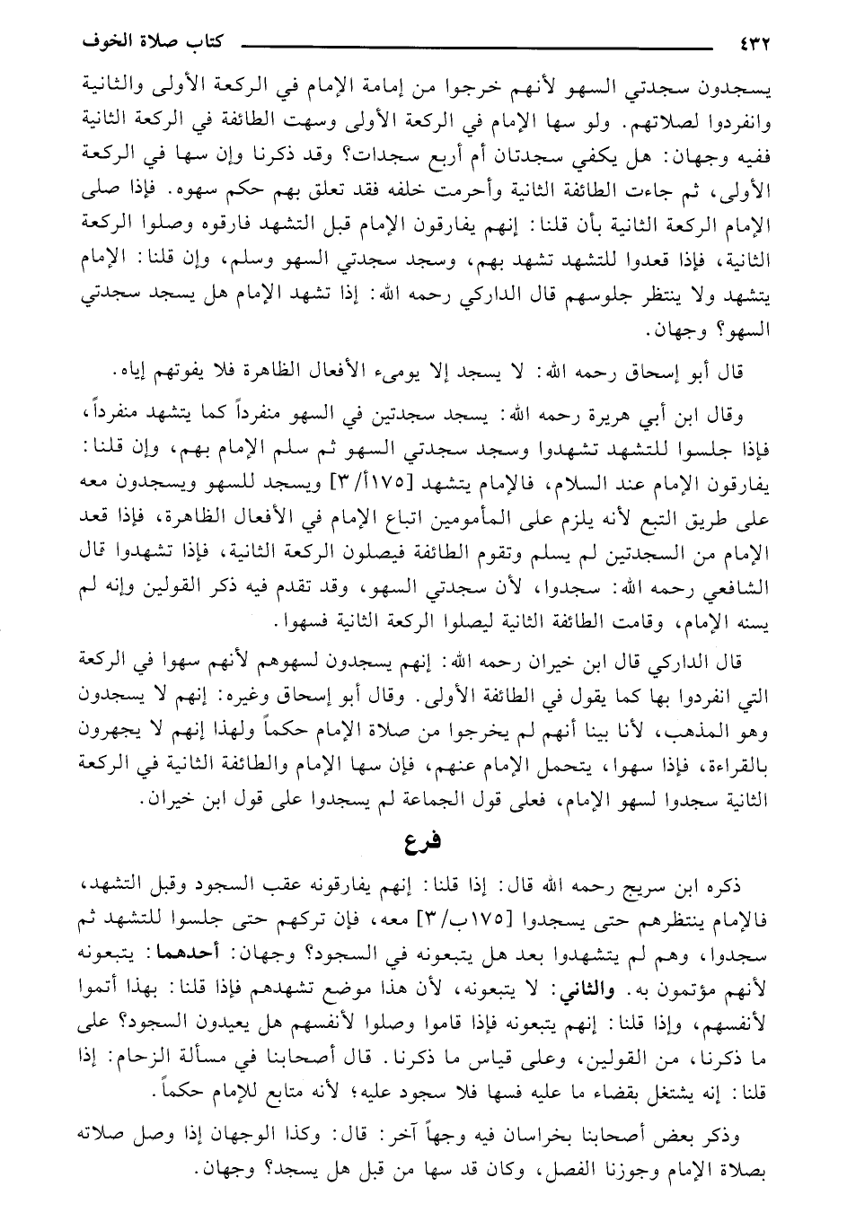 وقال ابن أبي هريرة رحمه الله: يسجد سجدتين في السهو منفردا كما يتشهد منفرداً، فإذا جلسوا للتشهد تشهدوا وسجد سجدتي السهو ثم سلم الإمام بهم، وإن قلنا: يفارقون الإمام عند السلام، فالإمام يتشهد [175 أ/ 3] ويسجد للسهو ويسجدون معه على طريق التبع لأنه يلزم على المأمومين إتباع الإمام في الأفعال الظاهرة، فإذا قعد الإمام من السجدتين لم يسلم وتقوم الطائفة فيصلون الركعة الثانية، فإذا تشهدوا قال الشافعي رحمه الله: سجدوا، لأن سجدتي السهو، وقد تقدم فيه ذكر القولين وانه لم يسنه الإمام، وقامت الطائفة الثانية ليصلوا الركعة الثانية فسهوا.