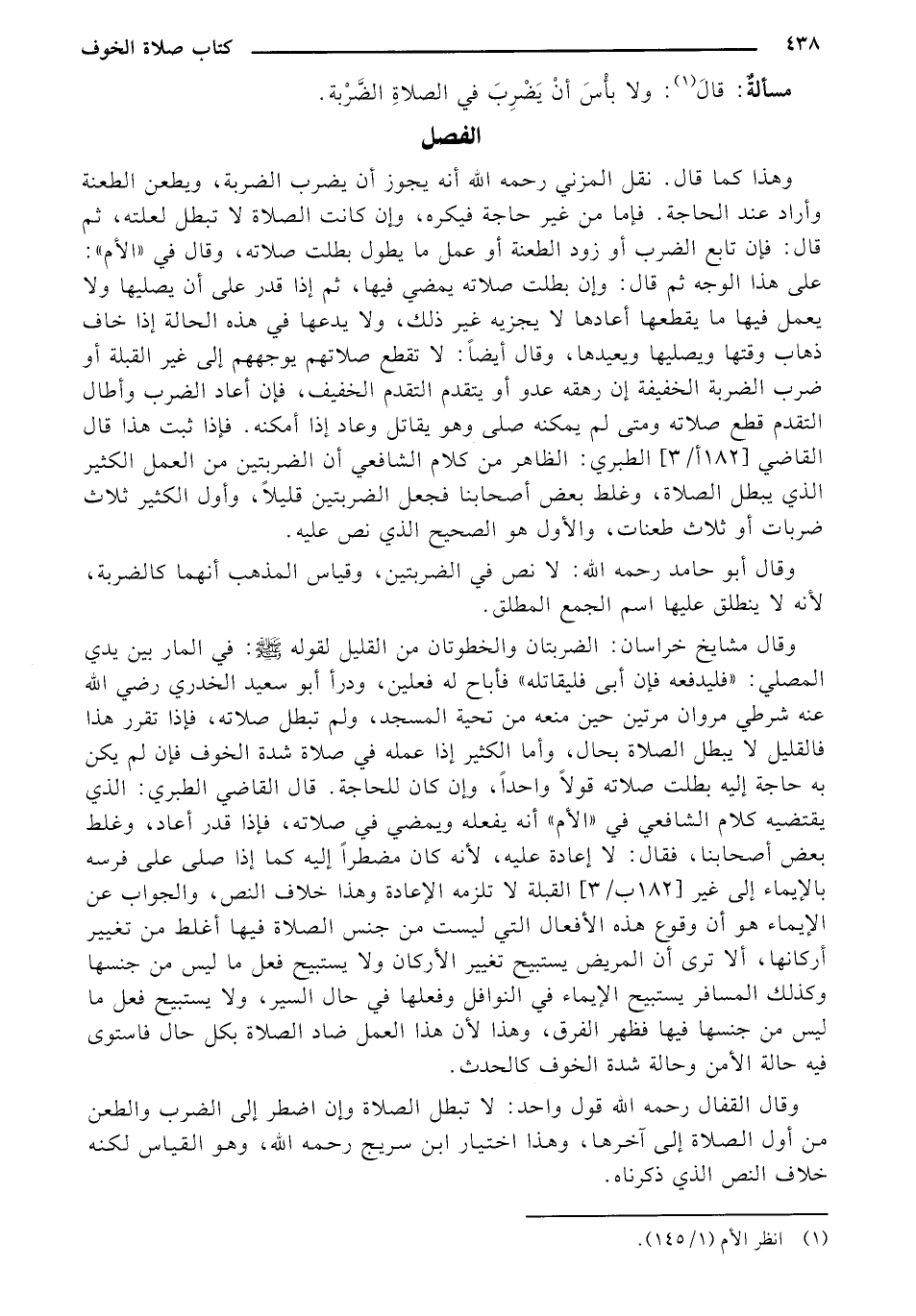 وقال القفال رحمه الله قول واحد: لا تبطل الصلاة وان اضطر إلى الضرب والطعن من أول الصلاة إلى آخرها، وهذا اختيار ابن سريج رحمه الله، وهو القياس لكنه خلاف النص الذي ذكرناه.