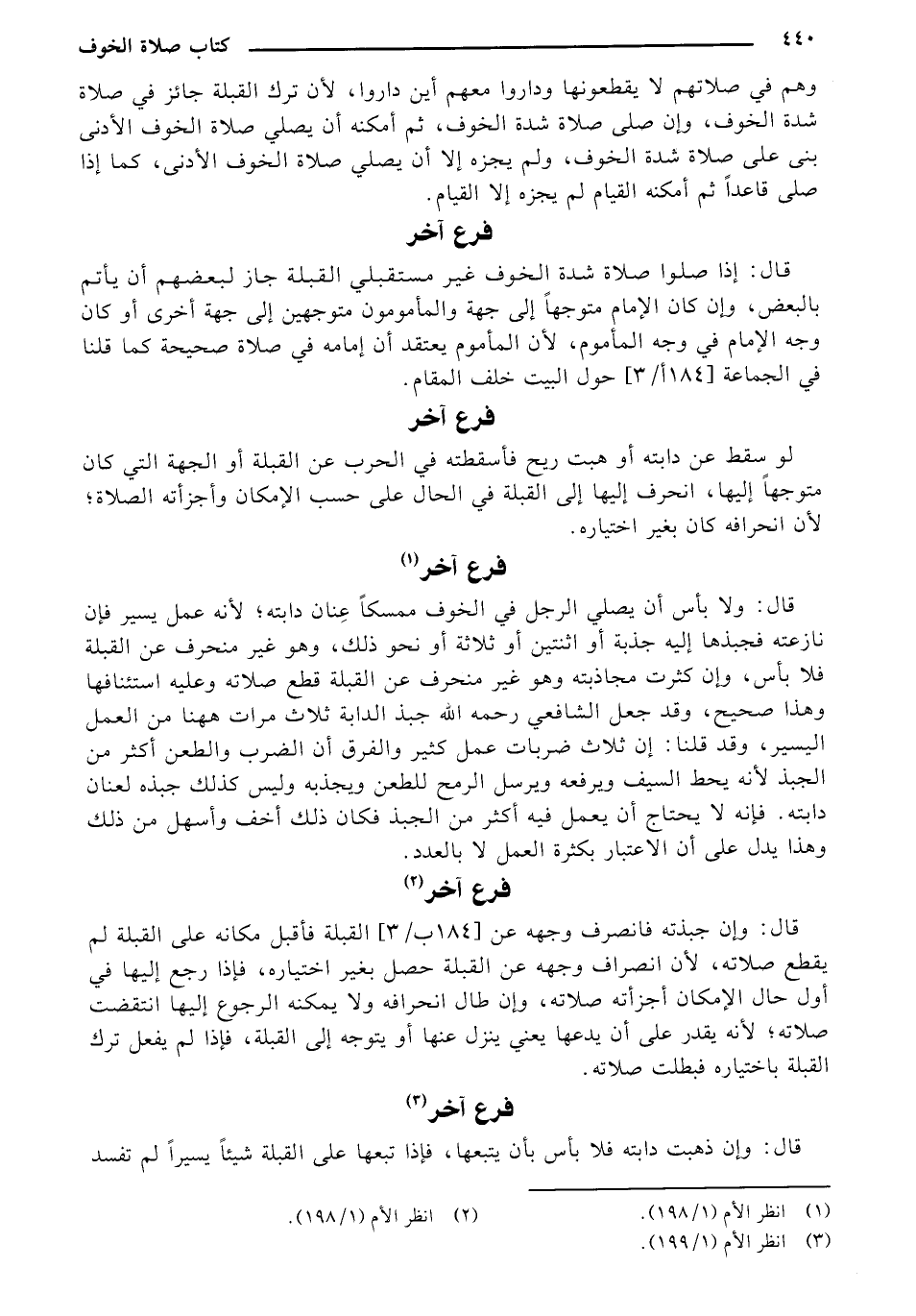 قال: ولا بأس أن يصلي الرجل في الخوف ممسكاً عنان دابته؛ لأنه عمل يسير فإن نازعته فجبذها إليه جذبة أو اثنتين أو ثلاثة أو نحو ذلك، وهو غير منحرف عن القبلة فلا بأس، وإن كثرت مجاذبته وهو غير منحرف عن القبلة قطع صلاته وعليه استئنافها وهذا صحيح، وقد جعل الشافعي رحمه الله جبذ الدابة ثلاث مرات ههنا من العمل اليسير، وقد قلنا: إن ثلاث ضربات عمل كثير والفرق أن الضرب والطعن أكثر من الجبذ لأنه يحط السيف ويرفعه ويرسل الرمح للطعن ويجذبه وليس كذلك جبذه لعنان دابته. فإنه لا يحتاج أن يعمل فيه أكثر من الجبذ فكان ذلك أخف وأسهل من ذلك وهذا يدل على أن الاعتبار بكثرة العمل لا بالعدد.