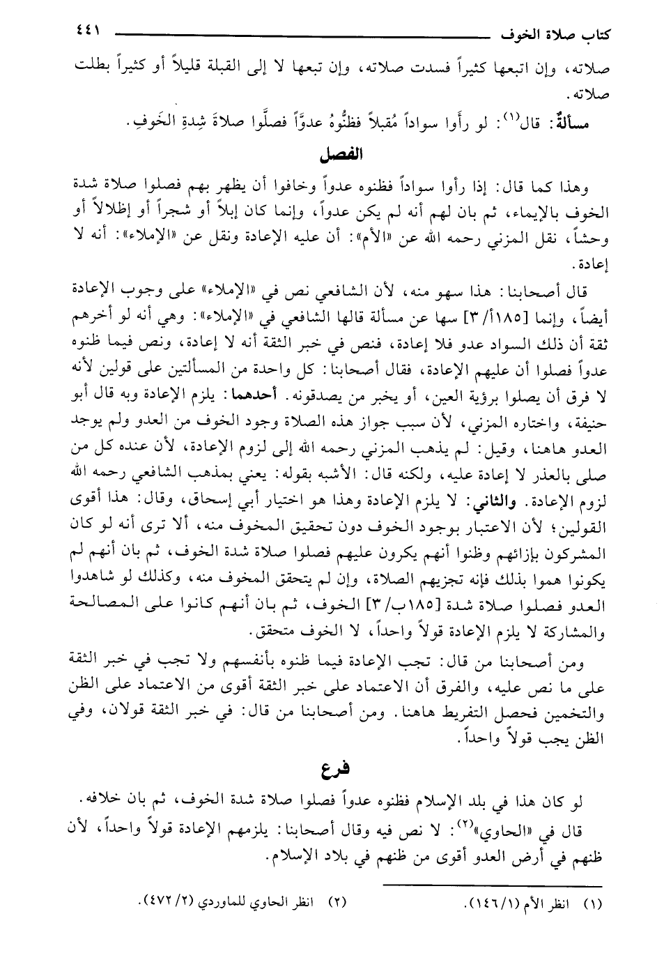 قال أصحابنا: هذا سهو منه، لأن الشافعي نص في "الإملاء" على وجوب الإعادة أيضا، وإنما [185 أ/ 3] سها عن مسألة قالها الشافعي في "الإملاء": وهي أنه لو أخرهم ثقة أن ذلك السواد عدو فلا إعادة، فنص في خبر الثقة أنه لا إعادة، ونص فيما ظنوه عدواً فصلوا أن عليهم الإعادة، فقال أصحابنا: كل واحدة من المسألتين على قولين لأنه لا فرق أن يصلوا برؤية العين، أو يخبر من يصدقونه. أحدهما: يلزم الإعادة وبه قال أبو حنيفة، واختاره المزني، لأن سبب جواز هذه الصلاة وجود الخوف من العدو ولم يوجد العدو هاهنا، وقيل: لم يذهب المزني رحمه الله إلى لزوم الإعادة، لأن عنده كل من صلى بالعذر لا إعادة عليه، ولكنه قال: الأشبه بقوله: يعني بمذهب الشافعي رحمه الله لزوم الإعادة. والثاني: لا يلزم الإعادة وهذا هو اختيار أبي إسحاق، وقال: هذا أقوى القولين؛ لأن الاعتبار بوجود الخوف دون تحقيق المخوف منه، ألا ترى أنه لو كان المشركون بإزائهم وظنوا أنهم يكرون عليهم فصلوا صلاة شدة الخوف، ثم بان أنهم يكونوا هموا بذلك فإنه تجزيهم الصلاة، وإن لم يتحقق المخوف منه، وكذلك لو شاهدوا العدو فصلوا صلاة شدة [185 ب/ 3] الخوف، ثم بان أنهم كانوا على المصالحة والمشاركة لا يلزم الإعادة قولا واحداً، لا الخوف متحقق.