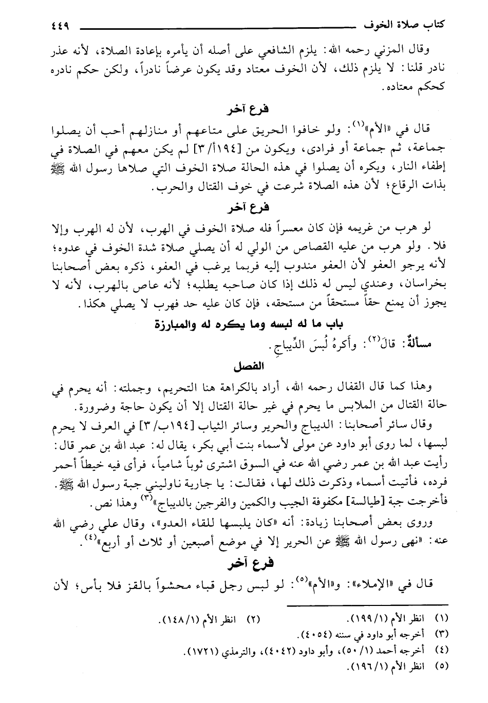 وروى بعض أصحابنا زيادة: أنه "كان يلبسها للقاء العدو"، وقال علي رضي الله عنه: "نهى رسول الله - صلى الله عليه وسلم - عن الحرير إلا في موضع إصبعين أو ثلاث أو اربع ".