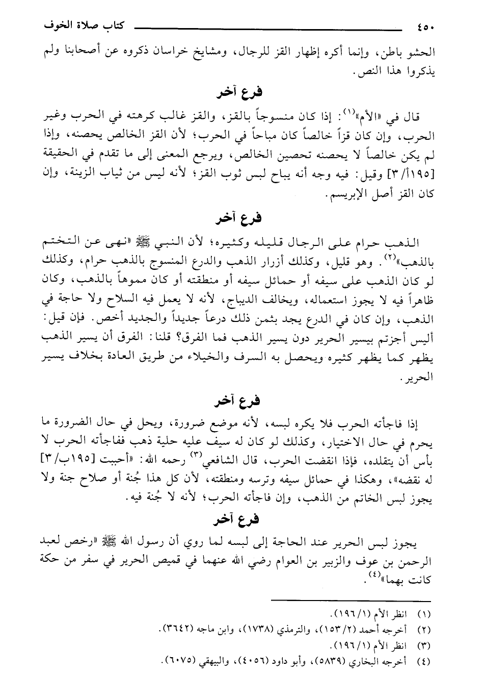 الذهب حرام على الرجال قليله وكثيره؛ لأن النبي - صلى الله عليه وسلم - "نهي عن التختم بالذهب". وهو قليل، وكذلك أزرار الذهب والدرع المنسوج بالذهب حرام، وكذلك لو كان الذهب على سيفه أو حمائل سيفه أو منطقته أو كان مموهاً بالذهب، وكان ظاهراً فيه لا يجوز استعماله، ويخالف الديباج، لأنه لا يعمل فيه السلاح ولا حاجة في الذهب، وان كان في الدرع يجد بثمن ذلك درعاً جديداً والجديد أخص. فإن قيل: أليس أجزتم بيسير الحرير دون يسير الذهب فما الفرق؟ قلنا: الفرق أن يسير الذهب يظهر كما يظهر كثيره ويحصل به السرف والخيلاء من طريق العادة بخلاف يسير الحرير.