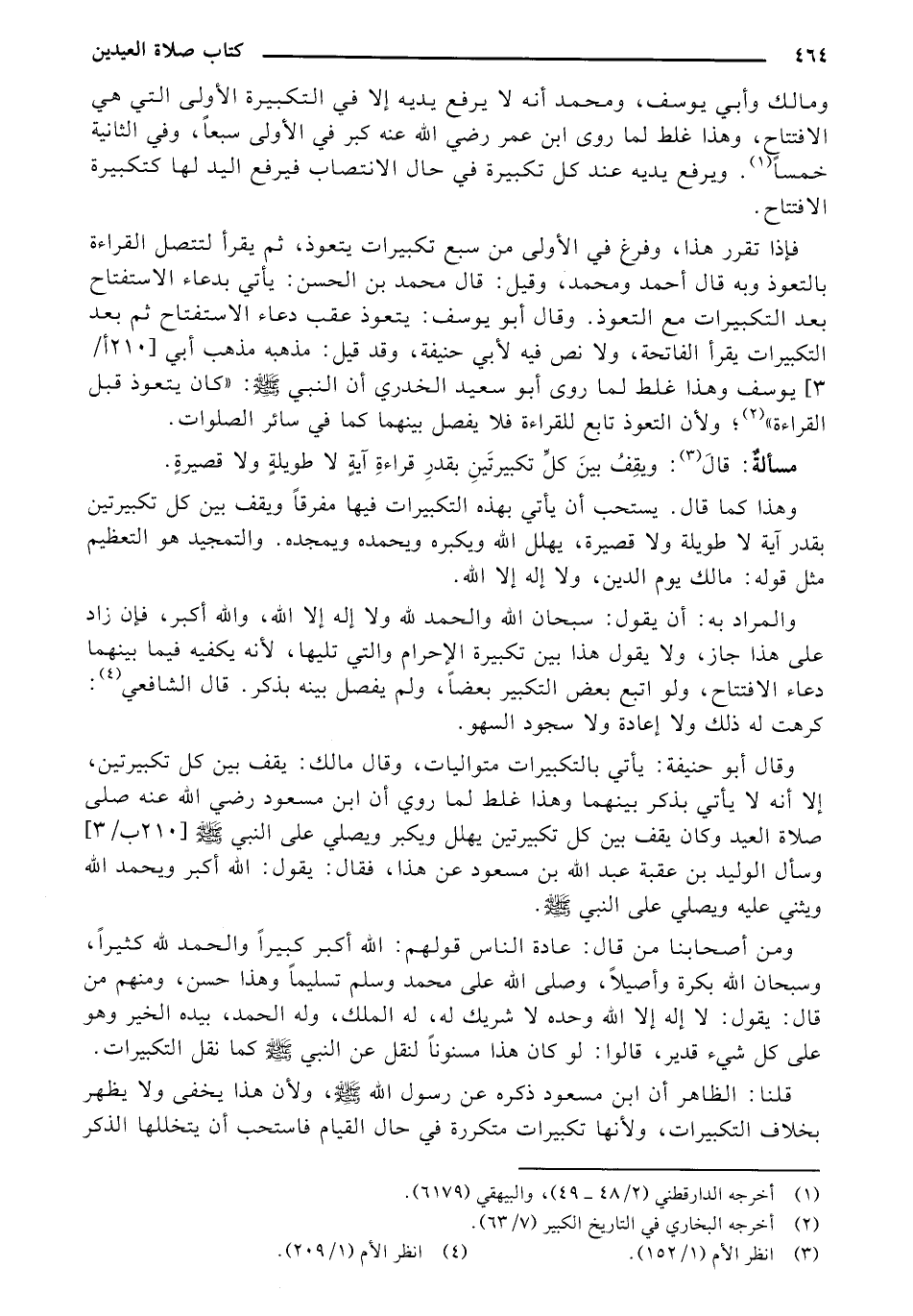 ومالك وأبي يوسف، ومحمد أنه لا يرفع يديه إلا في التكبيرة الأولى التي هي الافتتاح، وهذا غلط لما روى ابن عمر رضي الله عنه كبر في الأولى سبعا، وفي الثانية خمسا. ويرفع يديه عند كل تكبيرة في حال الانتصاب فيرفع اليد لها كتكبيرة الافتتاح.