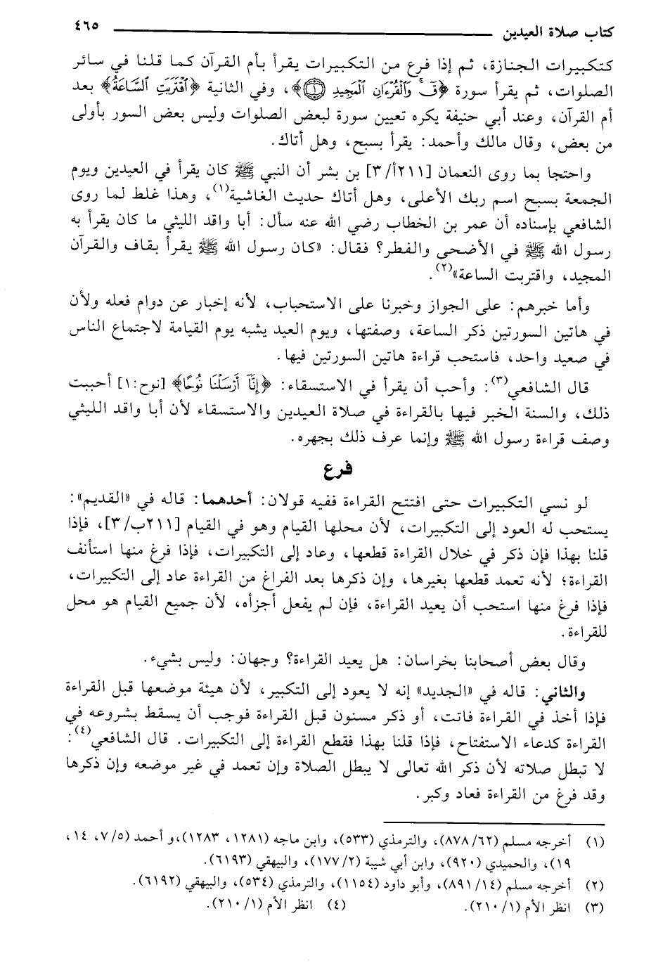 كتكبيرات الجنازة، ثم إذا فرع من التكبيرات يقرأ بأم القرآن كما قلنا في سائر الصلوات، ثم يقرأ سورة {ق والْقُرْآنِ المَجِيدِ}، وفي الثانية {اقْتَرَبَتِ السَّاعَةُ} بعد أم القرآن، وعند أبي حنيفة يكره تعيين سورة لبعض الصلوات وليس بعض السور بأولى من بعض، وقال مالك وأحمد: يقرأ بسبح، وهل أتاك.