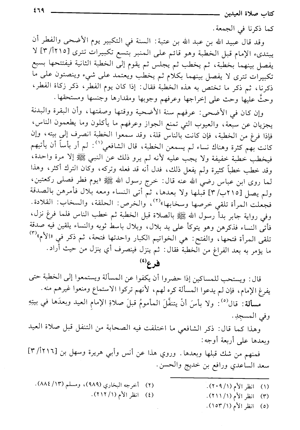 وإن كان في الأضحى: عرفهم سنة الأضحية ووقتها وصفتها، وأن البقرة والبدنة يجزيان عن سبعة، والعيوب التي تمنع الجواز وعرفهم ما يأكلون وما يطعمون الناس، فإا فرغ من الخطبة، فإن كانت بالناس قلة، وقد سمعوا الخطبة انصرف إلى بيته، وإن كانت بهم كثرة وهناك نساء لم يسمعن الخطبة، قال الشافعي: لم أر بأسا أن يأتيهم فيخطب خطبة خفيفة ولا يجب عليه لأنه لم يرو ذلك عن النبي - صلى الله عليه وسلم - إلا مرة واحدة، وقد خطب خطبا كثيرةولم يفعل ذلك، فدل أنه قد فعله وتركه، وكان الترك أكثر، وهذا ما روى ابن عباس رضي الله عنه قال: خرج رسول الله - صلى الله عليه وسلم - "يوم فطر فصلى ركعتين، ولم يصل "215 ب/3" قبلها ولا بعدها، ثم أتى النساء ومعه بلال فأمرهن بالصدقة فجعلت المرأة تلقي خرصها وسخابها"، والخرص: الحلقة، والسخاب: القلادة. وفي رواية جابر بدأ رسول الله - صلى الله عليه وسلم - بالصلاة قبل الخطبة ثم خطب الناس فلما فرغ نزل، فأتى النساء فذكرهن وهو يتوكأ على يد بلال، وبلال باسط ثوبه والنساء يلقين فيه صدقة تلقي المرأة فتحها، والفتح: هي الخواتيم الكبار واحدتها فتحة، ثم ذكر في "الأم" ما يؤمر به بعد الفراغ من الخطبة فقال: ثم ينزل فينصرف أي ينزل من حيث أراد.