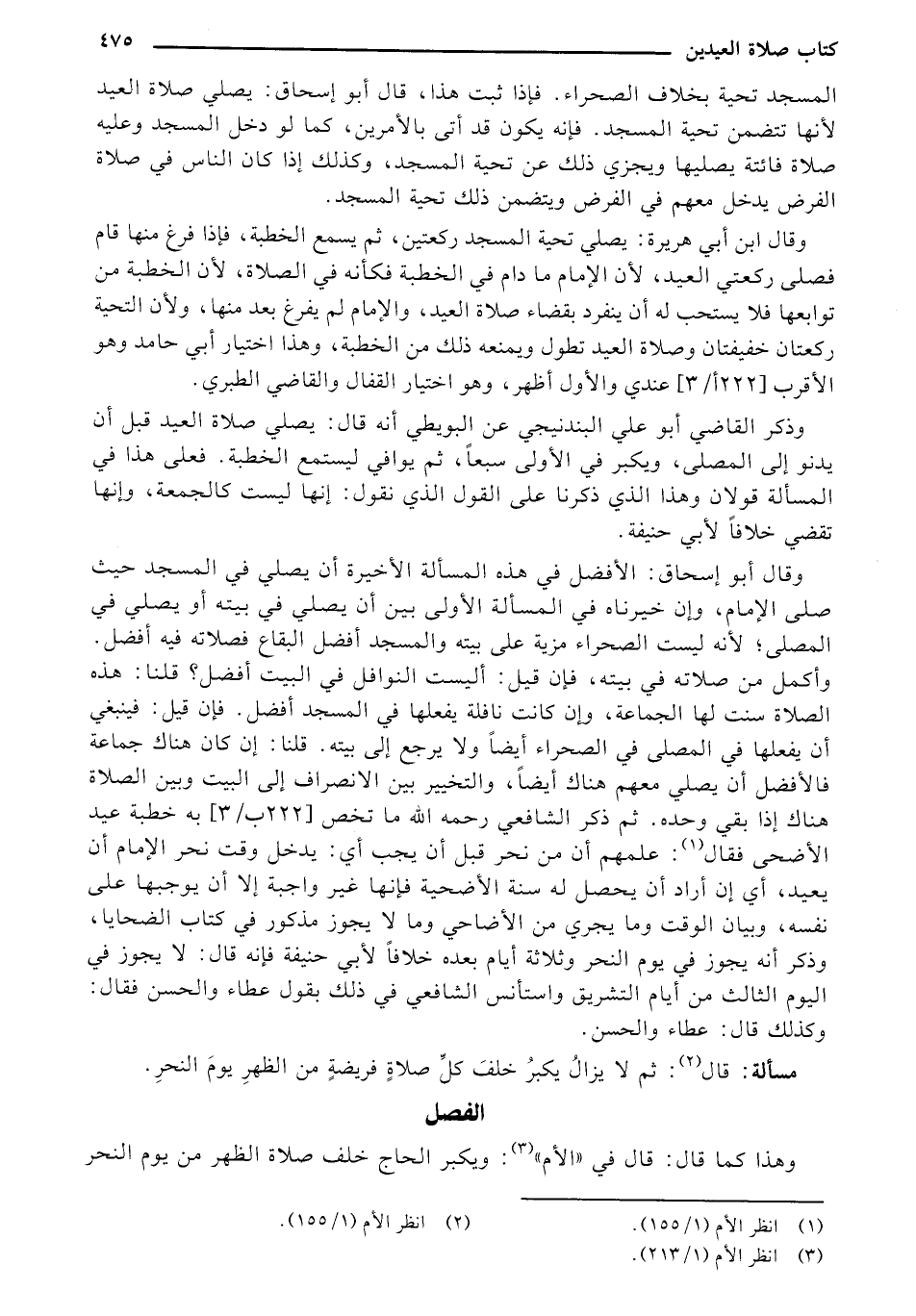 وقال أبو إسحاق: الأفضل في هذه المسألة الأخيرة أن يصلي في المسجد حيث صلى الإمام، وإن خيرناه في المسألة الأولى بين أن يصلي في بيته أو يصلي في المصلى؛ لأنه ليست الصحراء مزية على بيته والمسجد أفضل البقاع فصلاته فيه أفضل. وأكمل من صلاته في بيته، فإن قيل: أليست النوافل في البيت أفضل؟ قلنا: هذه الصلاة سنت لها الجماعة، وإن كانت نافلة يفعلها في المسجد أفضل .. فإن قيل: فينبغي أن يفعلها في المصلى في الصحراء أيضا ولا يرجع إلى بيته. قلنا: إن كان هناك جماعة فالأفضل أن يصلي معهم هناك أيضا، والتخيير بين الانصراف إلى البيت وبين الصلاة هناك إذا بقي وحده. ثم ذكر الشافعي رحمه الله ما تخص "222 ب/3" به خطبة عيد الأضحى فقال: علمهم أن من نحر قبل أن يجب أي: يدخل وقت نحر الإمام أن يعيد، أي إن أراد أن يحصل له سنة الأضحية فإنها غير واجبة إلا أن يوجبها على نفسه، وبيان الوقت وما يجري من الأضاحي وما لا يجوز مذكور في كتاب الضحايا، وذكر أنه يجوز في يوم النحر وثلاثة أيام بعده خلافا لأبي حنيفة فإنه قال: لا يجوز في اليوم الثالث من أيام التشريق واستأنس الشافعي في ذلك بقول عطاء والحسن فقال: وكذلك قال: عطاء والحسن.