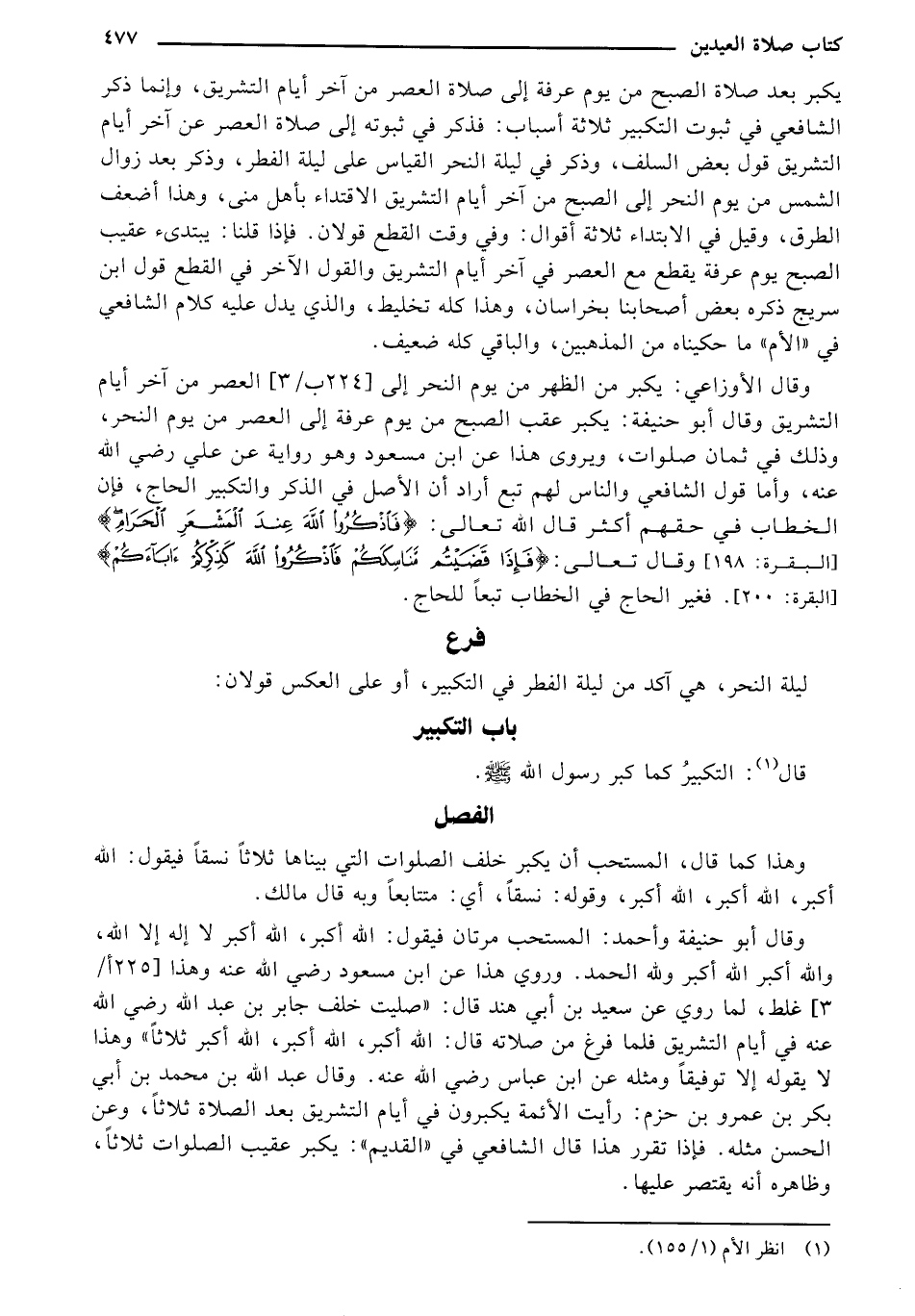 يكبر بعد صلاة الصبح من يوم عرفة إلى صلاة العصر من آخر أيام التشريق، وإنما ذكر الشافعي في ثبوت التكبير ثلاثة أسباب: فذكر في ثبوته إلى صلاة العصر عن آخر أيام التشريق قول بعض السلف، وذكر في ليلة النحر القياس على ليلة الفطر، وذكر بعد زوال الشمس من يوم النحر إلى الصبح من آخر أيام التشريق الاقتداء بأهل منى، وهذا أضعف الطرق، وقيل في الابتداء ثلاثة أقوال: وفي وقت القطع قولان. فإذا قلنا: يبتدئ عقيب الصبح يوم عرفة يقطع مع العصر في آخر أيام التشريق والقول الآخر في القطع قول ابن سريج ذكره بعض أصحابنا بخراسان، وهذا كله تخطيط، والذي يدل عليه كلام الشافعي في "الأم" ما حكيناه من المذهبين، والباقي كله ضعيف.