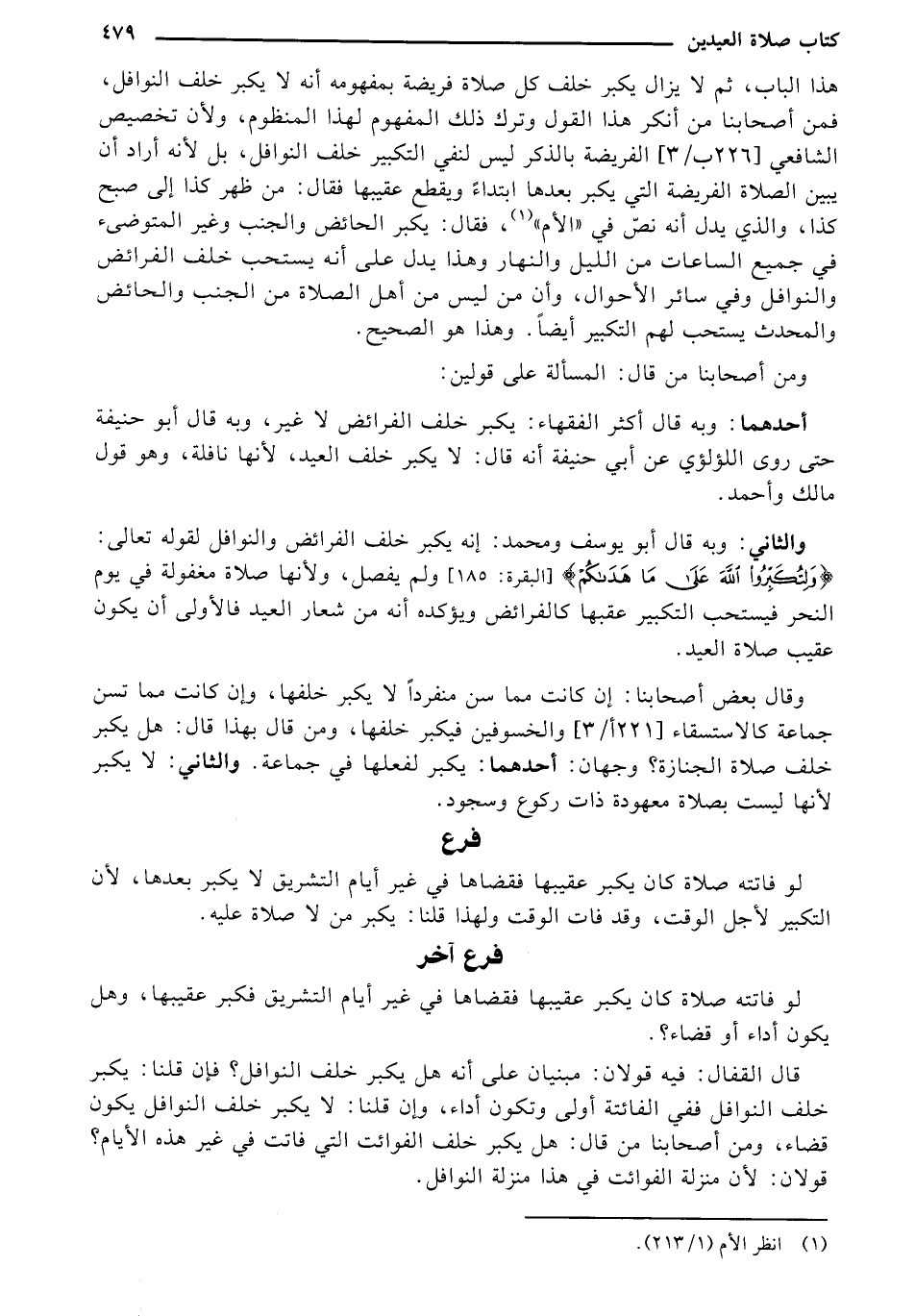 والثاني: وبه قال أبو يوسف ومحمد: إنه يكبر خلف الفرائض والنوافل لقوله تعالى: {ولِتُكبرّوا اللَّهَ عَلَى مَا هَدَاكُمْ} "البقرة: 185" ولم يفصل، ولأأنها صلاة مغفولة في يوم النحر فيستحب التكبير عقبها كالفرائض ويؤكده أنه من شعار العيد فالأولى أن يكون عقيب صلاة العيد.