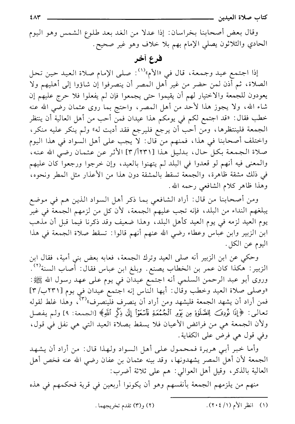 إذا اجتمع عيد وجمعة، قال في "الأم": صلى الإمام صلاة العيد حين تحل الصلاة، ثم أذن لمن حضر من غير أهل المصر أن ينصرفوا إن شاؤوا إلى أهليهم ولا يعودون للجمعة والاختيار لهم أن يقيموا حتى يجمعوا فإن لم يفعلوا فلا حرج عليهم إن شاء الله، ولا يجوز هذا لأحد من أهل المصر، واحتج بما روى عثمان بن عفان رضي الله عنه خطب فقال: "قد اجتمع لكم في يومكم هذا عيدان فمن أحب من أهل العالية أن ينتظر الجمعة فلينتظرها، ومن أحب أن يرجع فليرجع فقد أديت له" ولم ينكر عليه منكر، واختلف أصحابنا في هذا، فمنهم من قال: لا يجب على أهل السواد في هذا اليوم صلاة الجمعة بكل حال، بدليل ها "231 أ/3" الأثر عن عثمان رضي الله عنه، والمعنى فيه أنهم لو قعدوا في البلد لم يتهنوا بالعيد، وإن خرجوا ورجعوا كان عليهم في ذلك مشقة ظاهرة، والجمعة تسقط بالمشقة دون هذا من الأعذار مثل المطر ونحوه، وهذا ظاهر كلام الشافعي رحمه الله.