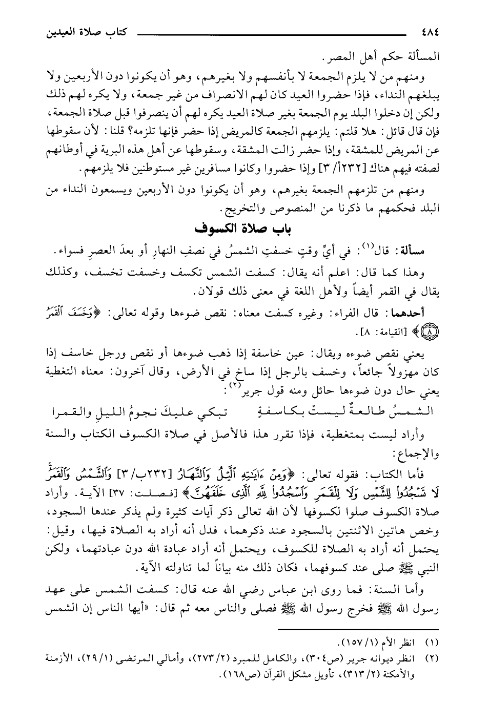 ومنهم من لا يلزم الجمعة لا بأنفسهم ولا بغيرهم، وهو أن يكونوا دون الأربعين ولا يبلغهم النداء، فإذا حضروا العيد كان لهم الانصراف من غير جمعة، ولا يكره لهم ذلك ولكن إن دخلوا البلد يوم الجمعة بغير صلاة العيد يكره لهم أن ينصرفوا قبل صلاة الجمعة، فإن قال قائل: هلا قلتم: يلزمهم الجمعة كالمريض إذا حضر فإنها تلزمه؟ قلنا: لأن سقوطها عن المريض للمشقة، وإذا حضر زالت المشقة، وسقوطها عن أهل هذه البرية في أوطانهم لصفته فيهم هناك "232 أ/3" وإذا حضروا وكانوا مسافرين غير مستوطنين فلا يلزمهم.