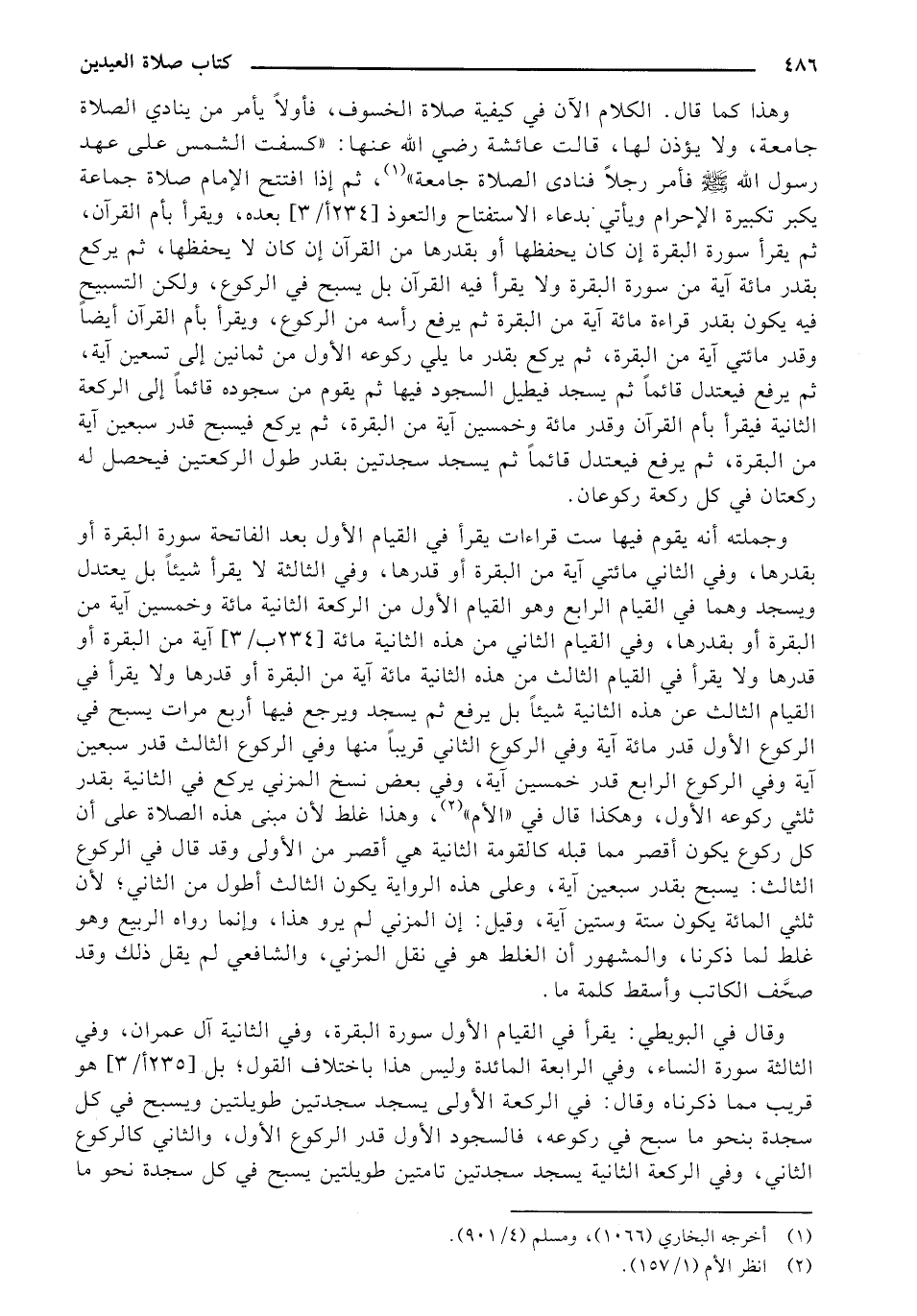 وجملته أنه يقوم فيها ست قراءات يقرأ في القيام الأول بعد الفاتحة سورة البقرة أو بقدرها، وفي الثاني مائتي آية من البقرة أو قدرها، وفي الثالثة لا يقرأ شيئا بل يعتدل ويسجد وهما في القيام الرابع وهو القيام الأول من الركعة الثانية مائة وخمسين آية من البقرة أو بقدرها، وفي القيام الثاني من هذه الثانية مائة "234 ب/3" آية من البقرة أو قدرها ولا يقرأ في القيام الثالث من هذه الثانية مائة آية من البقرة أو قدرها ولا يقرأ في القيام الثالث عن هذه الثانية شيئا بل يرفع ثم يسجد ويرجع فيها أربع مرات يسبح في الركوع الأول قدر مائة آية وفي الركوع الثاني قريبا منها وفي الركوع الثالث قدر سبعين آية وفي الركوع الرابع قدر خمسين آية، وفي بعض نسخ المزني يركع في الثانية بقدر ثلثي ركوعه الأول، وهكذا قال في " الأم"، وهذا غلط لان مبنى هذه الصلاة على أن كل ركوع يكون أقصر مما قبله كالقومة الثانية هي أقصر من الأولى وقد قال في الركوع الثالث: يسبح بقدر سبعين آية، وعلى هذه الرواية يكون الثالث أطول من الثاني؛ لأن ثلثي المائة يكون ستة وستين آية، وقيل: إن المزني لم يروا هذا، وإنما رواه الربيع وهو غلط لما ذكرنا، والمشهور أن الغلط هو في نقل المزني، والشافعي لم يقل ذلك وقد صحف الكاتب وأسقط كلمة ما.