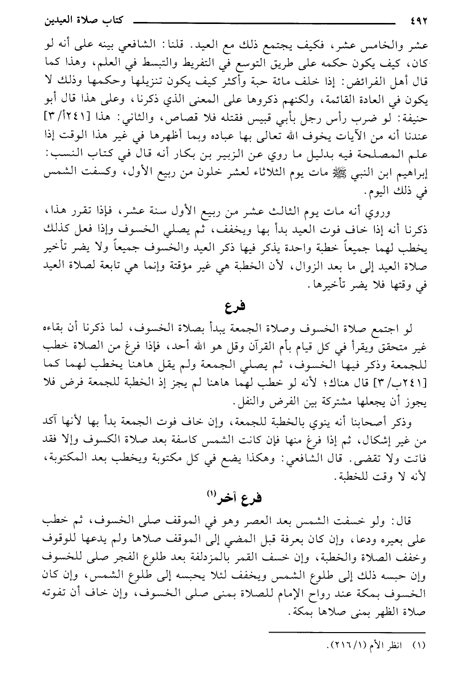 وروي أنه مات يوم الثالث عشر من ربيع الأول سنة عشر، فإذا تقرر هذا، ذكرنا أنه إذا خاف فوت العيد بدأ بها ويخفف، ثم يصلي الخسوف وإذا فعل كذلك يخطب لهما جميعا خطبة واحدة يذكر فيها ذكر العيد والخسوف جميعا ولا يضر تأخير صلاة العيد إلى ما بعد الزوال، لأن الخطبة هي غير مؤقتة وإنما هي تابعة لصلاة العيد في وقتها فلا يضر تأخيرها.