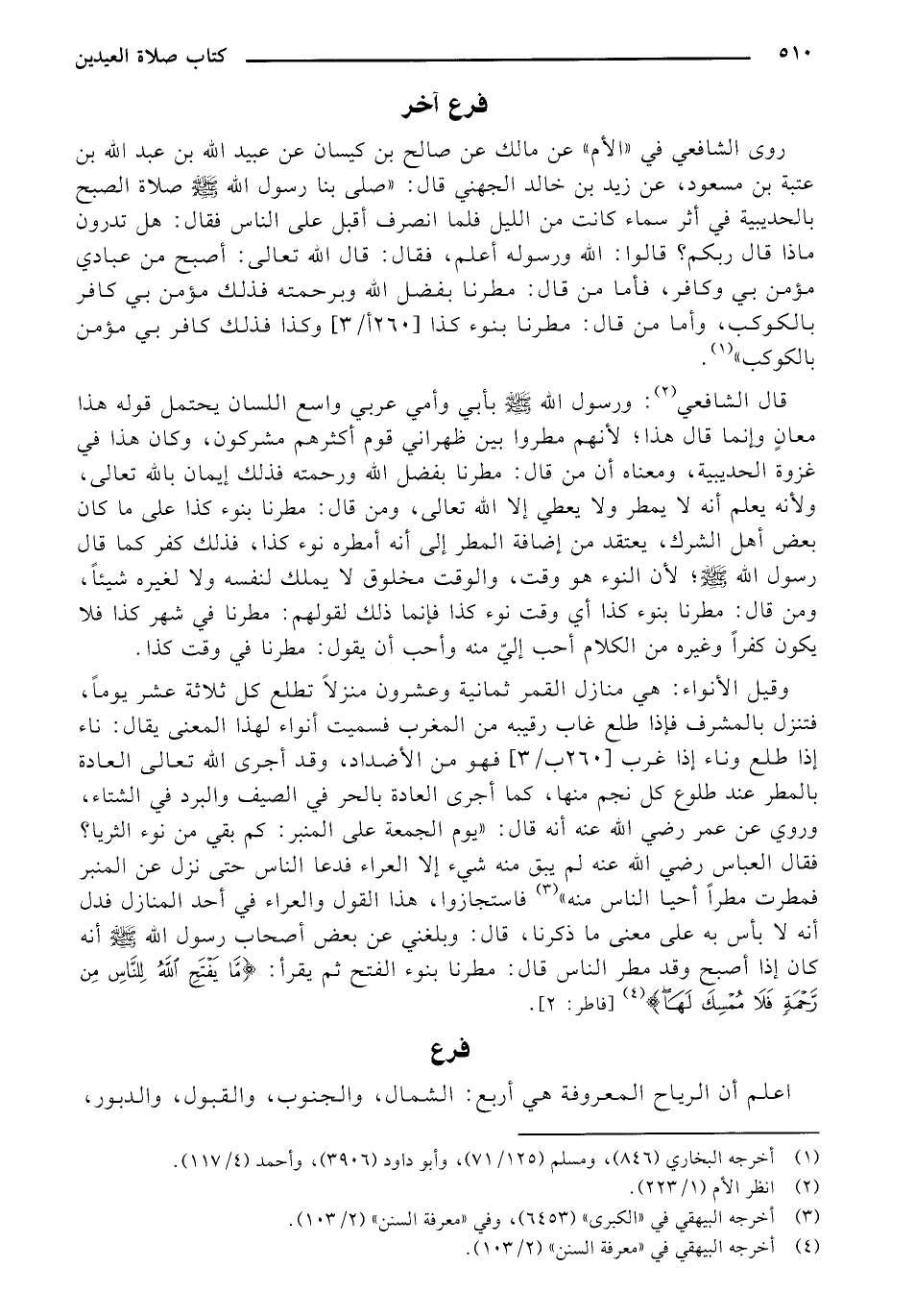 روى الشافعي في "الأم " عن مالك عن صالح بن كيسان عن عبيد الله بن عبد الله بن عتبة بن مسعود، عن زيد بن خالد الجهني قال: "صلى بنا رسول الله - صلى الله عليه وسلم - صلاة الصبح بالحديبية في أثر سماء كانت من الليل فلما انصرف أقبل على الناس فقال: هل تدرون ماذا قال ربكم؟ قالوا: الله ورسوله أعلم، فقال: قال الله تعالى: أصبح من عبادي مؤمن بي وكافر، فأما من قال: مطرنا بفضل الله وبرحمته فذلك مؤمن بي كافر بالكوكب، وأما من قال: مطرنا بنوء كذا [260 أ/ 3] وكذا فذلك كافر بي مؤمن بالكوكب".