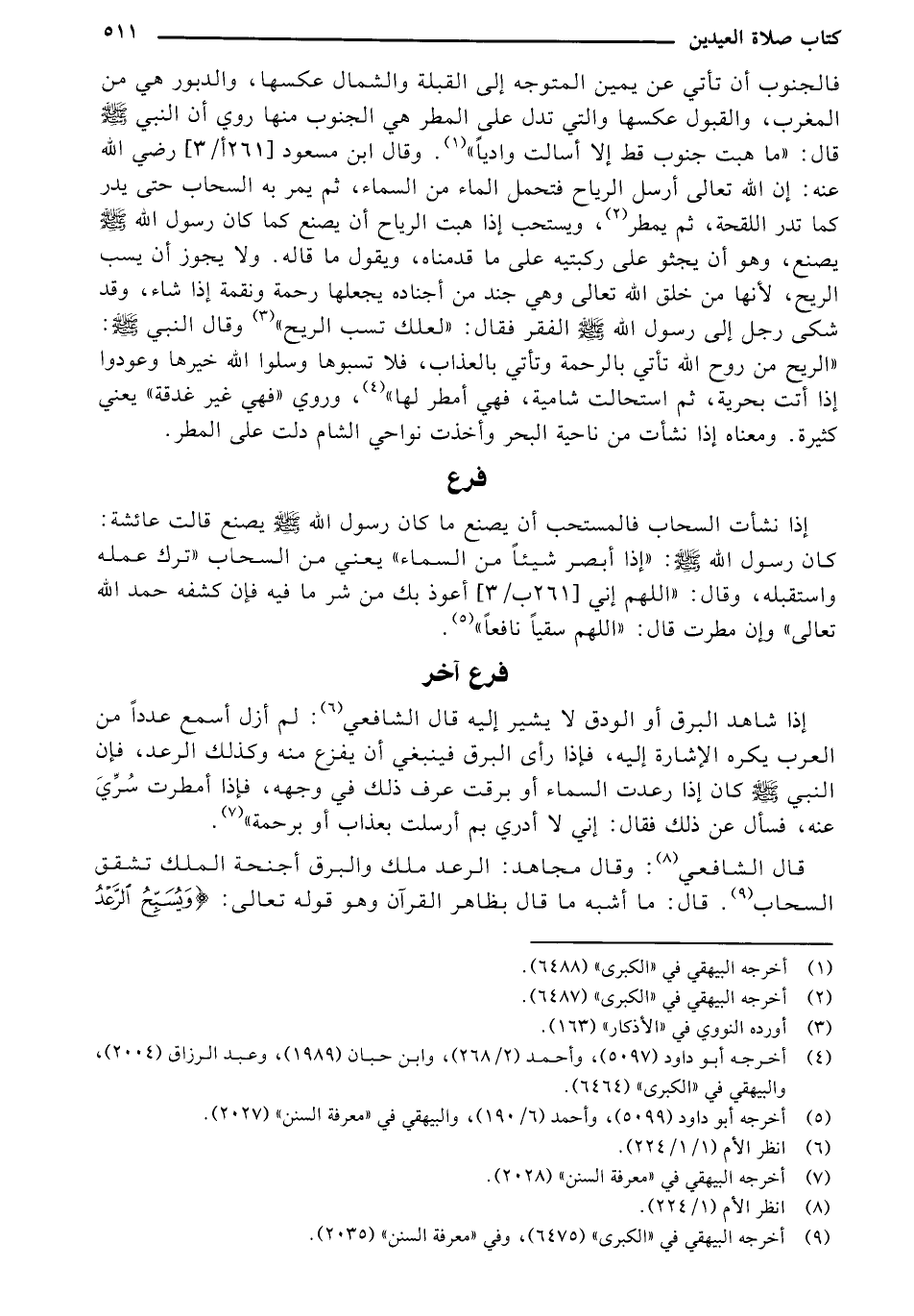 إذا شاهد البرق أو الودق لا يشير إليه قال الشافعي: لم أزل أسمع عدداً من العرب يكره الإشارة إليه، فإذا رأي البرق فينبغي أن يفزع منه وكذلك الرعد، فإن النبي - صلى الله عليه وسلم - كان إذا رعدت السماء أو برقت عرف ذلك في وجهه، فإذا أمطرت سُرَّيَ عنه، فسأل عن ذلك فقال: إني لا أدري بم أرسلت بعذاب أو برحمة".