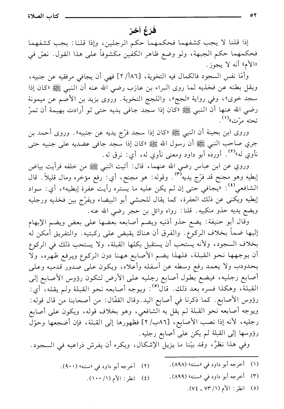 وروي عن ابن عباس رضي الله عنه، قال: أتيت النبي - صلى الله عليه وسلم - من خلفه فرأيت بياض إبطيه وهو مجنح قد فّرج يديه. وقوله: هو مجنح، أي: رفع مؤخره ومال قليلًا. قال الشافعي: (يجافي حتى إن لم يكن عليه ما يستره رأيت عفرة إبطيه)، أي: سواد إبطيه ويكنى عن ذلك العفرة، كما يقال للحبشي أبو البيضاء ويفّرج بين فخذيه ورجليه ويضع يديه حذو منكبيه. قلنا: رواه وائل بن حجر رضي الله عنه.