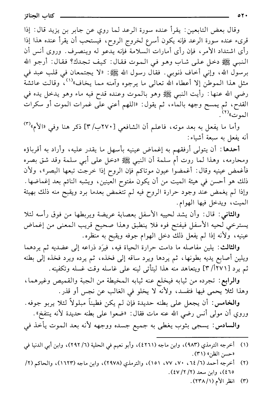 والثالث: يلين مفاصله ما دامت حرارة الحياة فيه، فيرد ذراعه إلى عضديه ثم يردهما ويلين أصابع يديه بطونها، ثم يردها ويرد ساقه إلى فخذه، ثم يرده ويرد فخذه إلى بطنه ثم يرد [271 أ/ 3] ويتعاهد منه هذا ليتأتى لينه على غاسله وقت غسله وتكفينه.