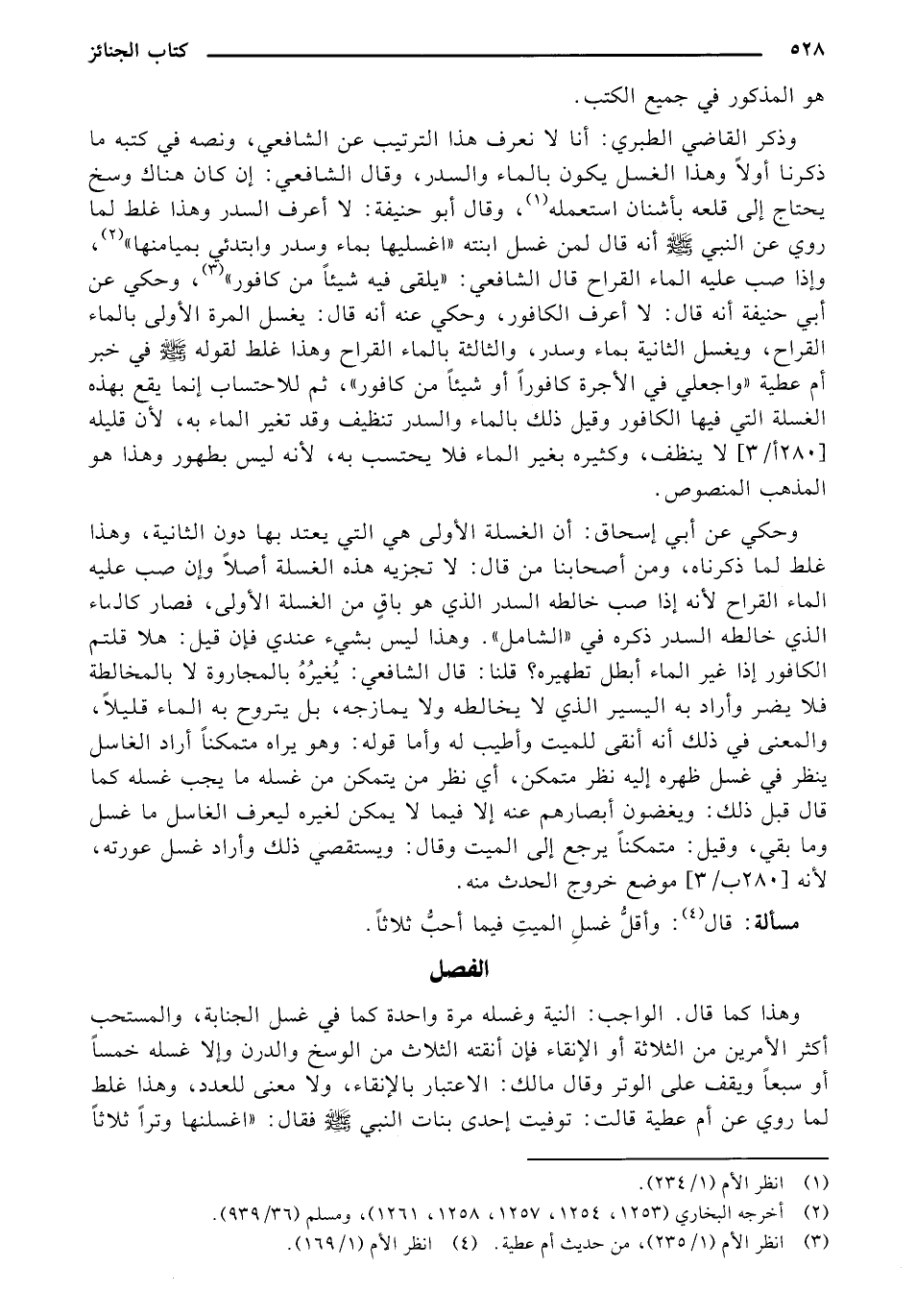 وذكر القاضي الطبري: أنا لا نعرف هذا الترتيب عن الشافعي، ونصه في كتبه ما ذكرنا أولاً وهذا الغسل يكون بالماء والسدر، وقال الشافعي: إن كان هناك وسخ يحتاج إلى قلعه بأشنان استعمله، وقال أبو حنيفة: لا أعرف السدر وهذا غلط لما روي عن النبي - صلى الله عليه وسلم - أنه قال لمن غسل ابنته "اغسليها بماء وسدر وابتدئي بميامنها"، وإذا صب عليه الماء القراح قال الشافعي: "يلقى فيه شيئاً من كافور"، وحكي عن أبي حنيفة أنه قال: لا أعرف الكافور، وحكي عنه أنه قال: يغسل المرة الأولى بالماء القراح، ويغسل الثانية بماء وسدر، والثالثة بالماء القراح وهذا غلط لقوله - صلى الله عليه وسلم - في خبر أم عطية "واجعلي في الأجرة كافوراً أو شيئاً من كافور"، ثم للاحتساب إنما يقع بهذه الغسلة التي فيها الكافور وقيل ذلك بالماء والسدر تنظيف وقد تغير الماء به، لأن قليله [280 أ / 3] لا ينظف، وكثيره بغير الماء فلا يحتسب به، لأنه ليس بطهور وهذا هو المذهب المنصوص.