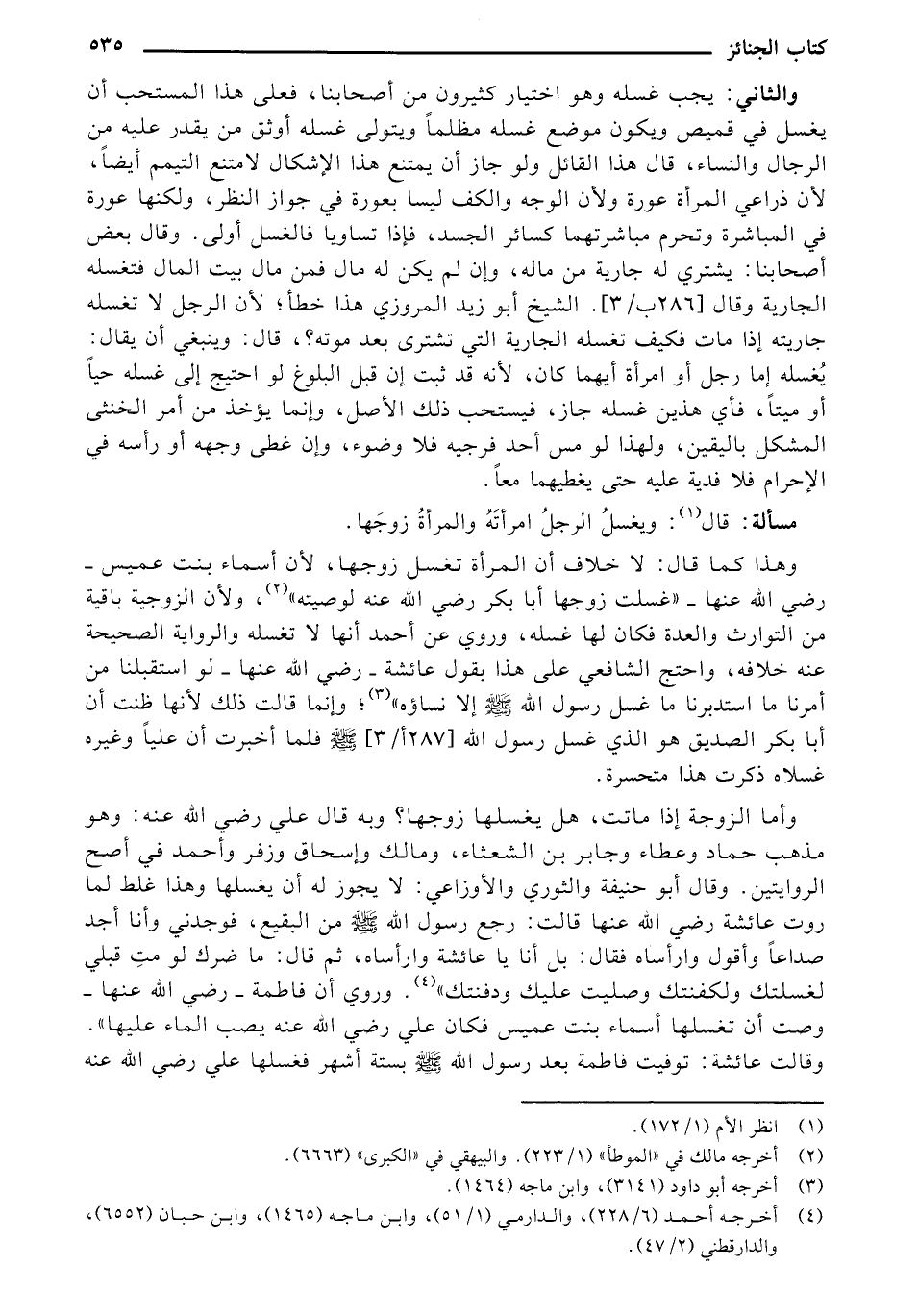 وأما الزوجة إذا ماتت، هل يغسلها زوجها؟ وبه قال علي رضي الله عنه: وهو مذهب حماد وعطاء وجابر بن الشعثاء، ومالك وإسحاق وزفر وأحمد في أصح الروايتين. وقال أبو حنيفة والثوري والأوزاعي: لا يجوز له أن يغسلها وهذا غلط لما روته عائشة رضي الله عنها قالت: رجع رسول الله - صلى الله عليه وسلم - من البقيع، فوجدني وأنا أجد صداعاً وأقول وارأساه فقال: بل أنا يا عائشة وارأساه، ثم قال: ما ضرك لو مت قبلي لغسلتك ولكفنتك وصليت عليك ودفنتك". وروي أن فاطمة _ رضي الله عنها _ ومسته أن تغسلها أسماء بنت عميس فكان علي ورضي الله عنه يصب الماء عليها". وقالت عائشة: توفيت فاطمة بعد رسول الله - صلى الله عليه وسلم - بستة أشهر فغسلها علي رضي الله عنه