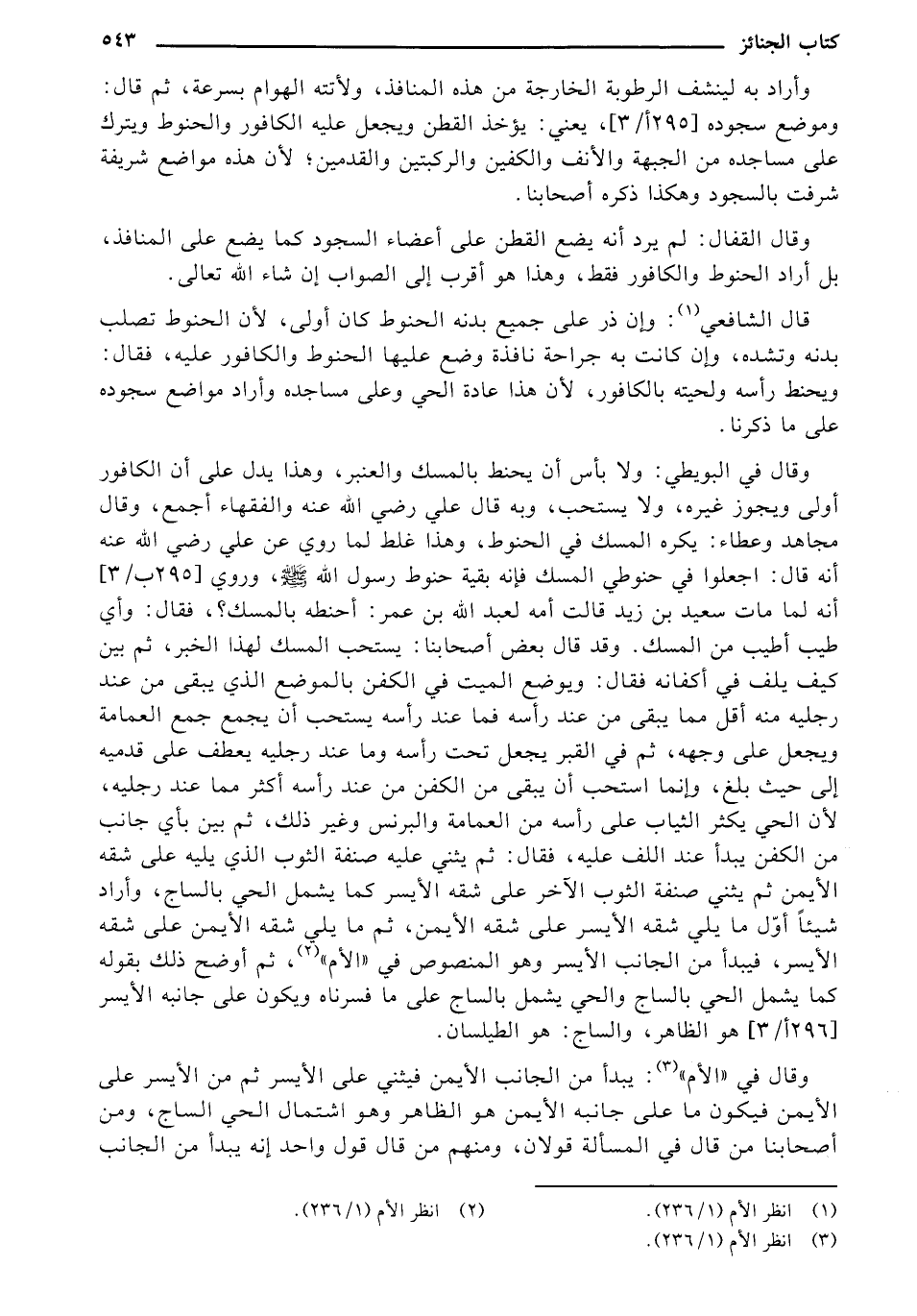 وقال في البويطي: ولا بأس أن يحنط بالمسك والعنبر، وهذا يدل على أن الكافور أولى ويجوز غيره، ولا يستحب، وبه قال علي رضي الله عنه والفقهاء أجمع، وقال مجاهد وعطاء: يكره المسك في الحنوط، وهذا غلط لما روي عن علي رضي الله عنه أنه قال: اجعلوا في حنوطي المسك فإنه بقية حنوط رسول الله - صلى الله عليه وسلم -، وروي [295 ب / 3] أنه لما مات سعيد بن زيد قالت أمه لعبد الله بن عمر: أحنطه بالمسك؟، فقال: وأي طيب أطيب من المسك. وقد قال بعض أصحابنا: يستحب المسك لهذا الخبر، ثم بين كيف يلف في أكفانه فقال: ويوضع الميت في الكفن بالموضع الذي يبقى من عنه رجليه منه أقل مما يبقى من عند رأسه فما عند رأسه يستحب أن يجمع جمع العمامة ويجعل على وجهه، ثم في القبر يجعل تحت رأسه وما عند رجليه يعطف على قدميه إلى حيث بلغ، وإنما استحب أن يبقى من الكفن من عند رأسه أكثر مما عند رجليه، لأن الحي يكثر الثياب على رأسه من العمامة والبرنس وغير ذلك، ثم بين بأي جانب من الكفن يبدأ عند اللف عليه، فقال: ثم يثني عليه صنفة الثوب الذي يليه على شقه الأيمن ثم يثني صنفة الثوب الآخر على شقه الأيسر كما يشمل الحي بالساج، وأراد شيئاً أق ل ما يلي شقه الأيسر على شقه الأيمن، ثم ما يلي شقه الأيمن على شقه الأيسر، فيبدأ من الجانب الأيسر وهو المنصوص في "الأم"، ثم أوضح ذلك بقوله كما يشمل الحي بالساج والحي يشمل بالساج على ما فسرناه ويكون على جانبه الأيسر [296 أ / 3] هو الظاهر، والساج: هو الطيلسان.