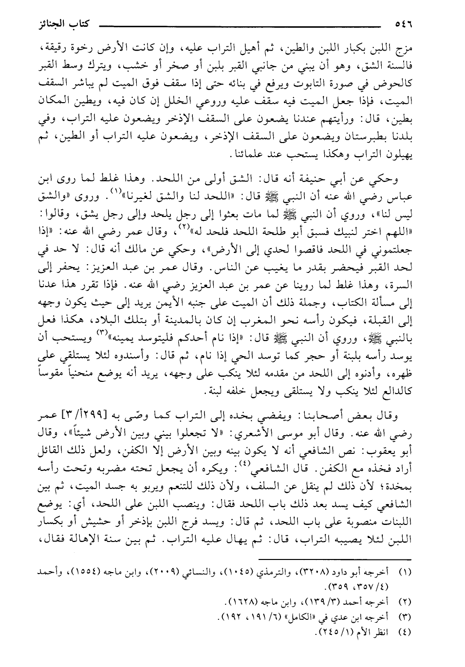 وقال بعض أصحابنا: ويفضي بخده إلى التراب كما وصى [299 أ / 3] عمر رضي الله عنه. وقال أبو موسى الأشعري: "لا تجعلوا بيني وبين الأرض شيئاً"، وقال أبو يعقوب: نص الشافعي أنه لا يكون بينه وبين الأرض إلا الكفن، ولعل ذلك القائل أواد فخذه مع الكفن. قال الشافعي: ويكره أن يجعل تحته مضربه وتحت رأسه بمخدة: لأن ذلك لم ينقل عن السلف، ولأن ذلك للتنعم ويربو به جسد الميت، ثم بين الشافعي كيف يسد بعد ذلك باب اللحد فقال: وينصب اللبن على اللحد، أي: يوضع اللبنات منصوبة على باب اللحد، ثم قال: ويسد فرج اللبن بإذخر أو حشيش أو بكسار اللبن لئلا يصيبه التواب، قال: ثم يهال عليه التراب. ثم بين سنة الإهالة فقال،