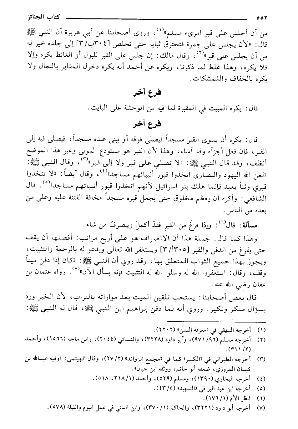 من أن أجلس على قبر امرئ مسلم"، وروى أصحابنا عن أبي هريرة أن النبي - صلى الله عليه وسلم - قال: "لأن يجلس على جمرة فتحترق ثيابه حتى تخلص [304 ب/3] إلى جلده خير له من أن يجلس على قبر"، وقال مالك: إن جلس على القبر للبول أو الغائط يكره وإلا فلا يكره، وهذا غلط لما ذكرنا، ويكره عن أحمد أنه يكره دخول المقابر بالنعال ولا يكره بالخفاف والشمشكات.
