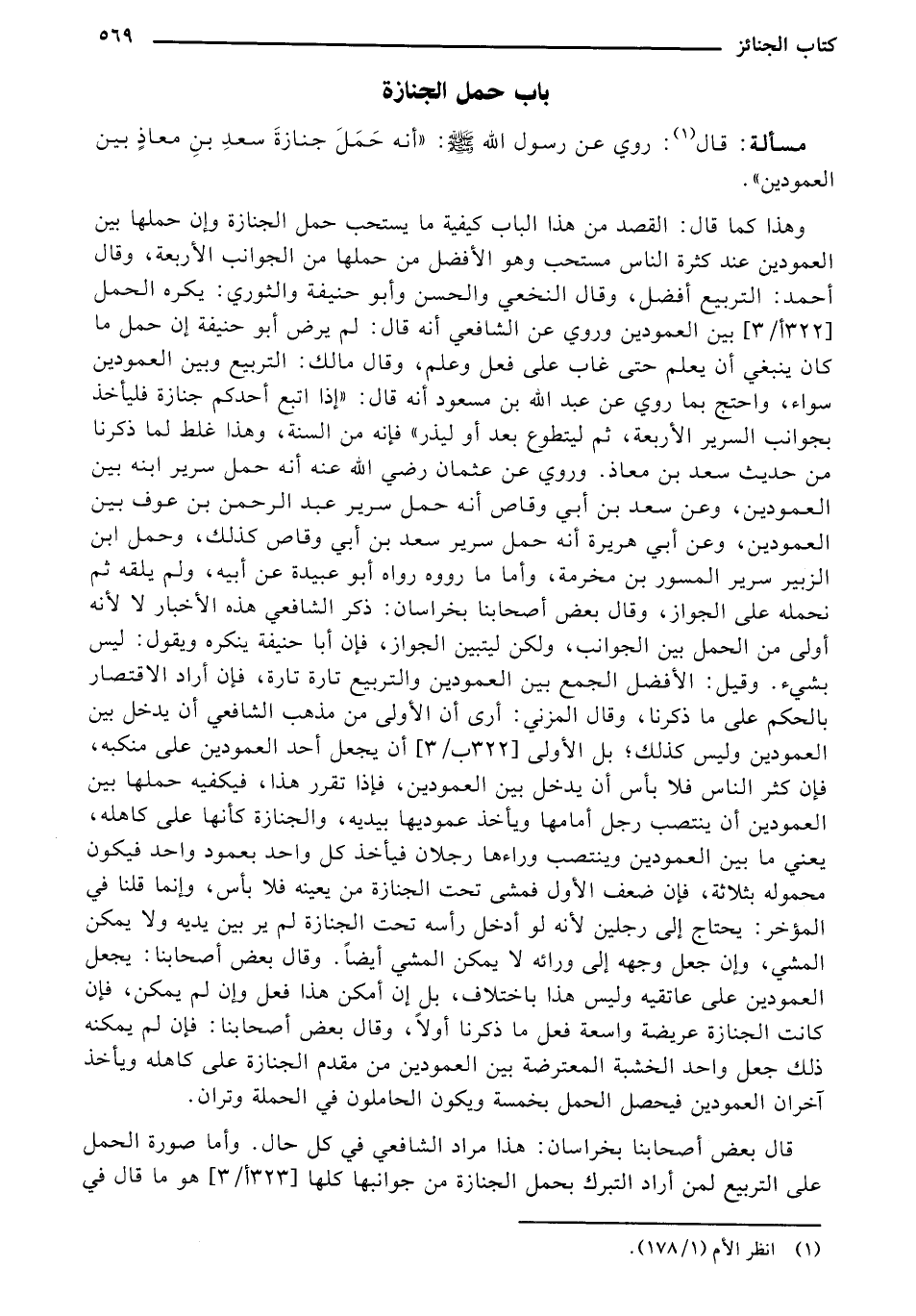 وهذا كما قال: القصد من هذا الباب كيفية ما يستحب حمل الجنازة وإن حملها بين العمودين عند كثرة الناس مستحب وهو الأفضل من حملها من الجوانب الأربعة، وقال أحمد: التربيع أفضل، وقال النخعي والحسن وأبو حنيفة والثوري: يكره الحمل [322 أ/3] بين العمودين وروي عن الشافعي أنه قال: لم يرض أبو حنيفة إن حمل ما كان ينبغي أن يعلم حتى غاب على فعل وعلم، وقال مالك: التربيع وبين العمودين سواء، واحتج بما روي عن عبد الله بن مسعود أنه قال: "إذا اتبع أحدكم جنازة فليأخذ بجوانب السرير الأربعة، ثم ليتطوع بعد أو ليذر" فإنه من السنة، وهذا غلط لما ذكرنا من حديث سعد بن معاذ. وروي عن عثمان رضي الله عنه أنه حمل سرير ابنه بين العمودين، وعن سعد بن أبي وقاص أنه حمل سرير عبد الرحمن بن عوف بين العمودين، وعن أبي هريرة أنه حمل سرير سعد بن أبي وقاص كذلك، وحمل ابن الزبير سرير المسور بن مخرمة، وأما ما رووه رواه أبو عبيدة عن أبيه، ولم يلقه ثم نحمله على الجواز، وقال بعض أصحابنا بخراسان: ذكر الشافعي هذه الأخبار لا لأنه أولى من الحمل بين الجوانب، ولكن ليتبين الجواز، فإن أبا حنيفة ينكره ويقول: ليس بشيء. وقيل: الأفضل الجمع بين العمودين والتربيع تارة تارة، فإن أراد الاقتصار بالحكم على ما ذكرنا، وقال المزني: أرى أن الأولى من مذهب الشافعي أن يدخل بين العمودين وليس كذلك؛ بل الأولى [322 ب/3] أن يجعل أحد العمودين على منكبه، فإن كثر الناس فلا بأس أن يدخل بين العمودين، فإذا تقرر هذا، فيكفيه حملها بين العمودين أن ينتصب رجل أمامها ويأخذ عموديها بيديه، والجنازة كأنها على كاهله، يعني ما بين العمودين وينتصب وراءها رجلان فيأخذ كل واحد بعمود واحد فيكون محموله بثلاثة، فإن ضعف الأول فمشى تحت الجنازة من يعينه فلا بأس، وإنما قلنا في المؤخر: يحتاج إلى رجلين لأنه لو أدخل رأسه تحت الجنازة لم ير بين يديه ولا يمكن الشيء وإن جعل وجهه إلى ورائه لا يمكن المشي أيضاً. وقال بعض أصحابنا: يجعل العمودين على عاتقيه وليس هذا باختلاف، بل إن أمكن هذا فعل وإن لم يمكن، فإن كانت الجنازة عريضة واسعة فعل ما ذكرنا أولاً، وقال بعض أصحابنا: فإن لم يمكنه ذلك جعل واحد الخشبة المعترضة بين العمودين من مقدم الجنازة على كاهله ويأخذ آخران العمودين فيحصل الحمل بخمسة ويكون الحاملون في الحملة وتران.