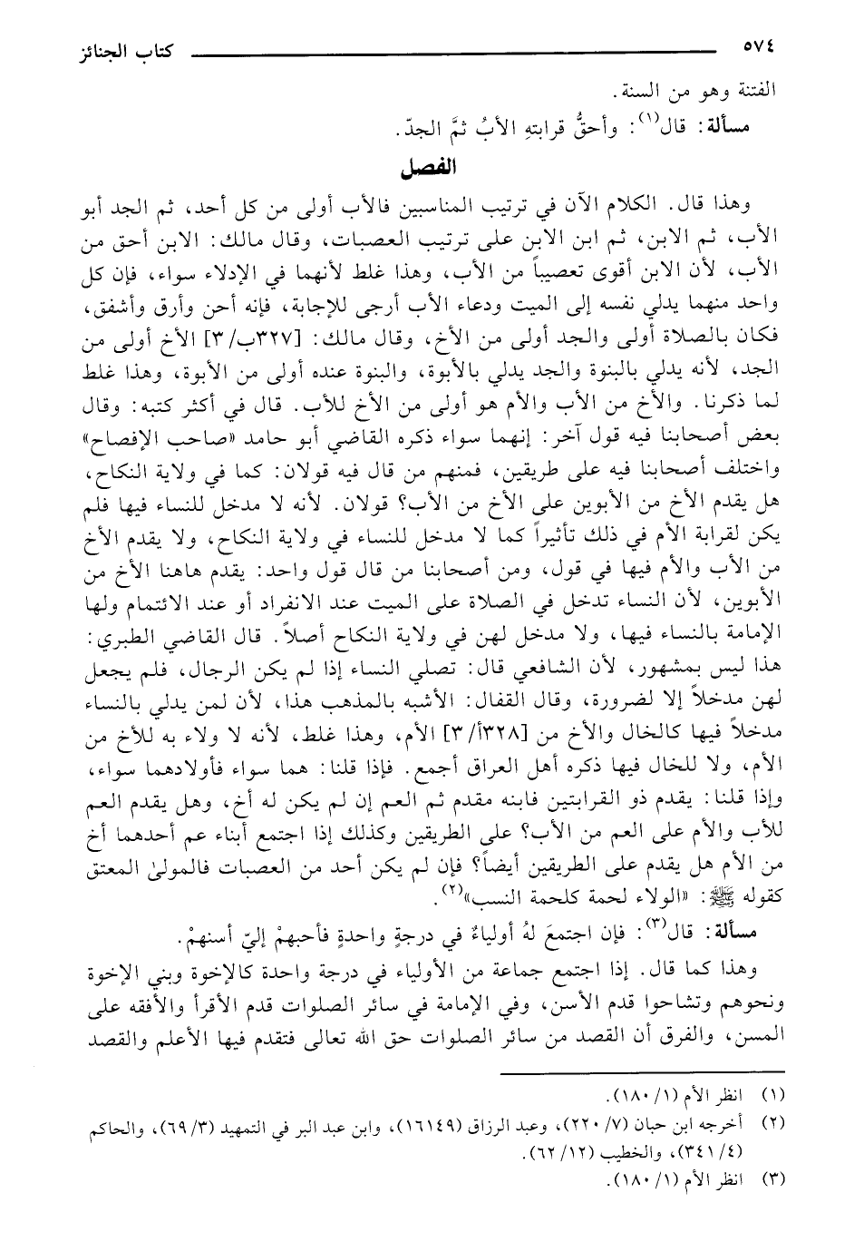 وهذا قال. الكلام الآن في ترتيب المناسبين فالأب أولى من كل أحد، ثم الجد أبو الأب، ثم الابن، ثم ابن الابن على ترتيب العصبات، وقال مالك: الابن أحق من الأب، لأن الابن أقوى تعصيباً من الأب، وهذا غلط لأنهما في الإدلاء سواء، فإن كل واحد منهما يدلي نفسه إلى الميت ودعاء الأب أرجى للإجابة، فإنه أحن وأرق وأشفق، فكان بالصلاة أولى والجد أولى من الأخ، وقال مالك: [327 ب/3] الأخ أولى من الجد، لأنه يدلي بالبنوة والجد يدلي بالأبوة، والبنوة عنده أولى من الأبوة، وهذا غلط لما ذكرنا. والأخ من الأب والأم هو أولى من الأخ للأب. قال في أكثر كتبه: وقال بعض أصحابنا فيه قول أخر: إنهما سواء ذكره القاضي أبو حامد "صاحب الإفصاح" واختلف أصحابنا فيه على طريقين، فمنهم من قال فيه قولان: كما في ولاية النكاح، هل يقدم الأخ من الأبوين على الأخ من الأب؟ قولان. لأنه لا مدخل للنساء فيها فلم يكن لقرابة الأم في ذلك تأثيراً كما لا مدخل للنساء في ولاية النكاح، ولا يقدم الأخ من الأب والأم فيها في قول، ومن أصحابنا من قال قول واحد: يقام هاهنا الأخ من الأبوين، لأن النساء تدخل في الصلاة على الميت عند الانفراد أو عند الائتمام ولها الإمامة بالنساء فيها، ولا مدخل لهن في ولاية النكاح أصلاً. قال القاضي الطبري: هذا ليس بمشهور، لأن الشافعي قال: تصلي النساء إذا لم يكن الرجال، فلم يجعل لهن مدخلاً إلا لضرورة، وقال القفال: الأشبه بالمذهب هذا، لأن لمن يدلي بالنساء مدخلاً فيها كالخال والأخ من [328 أ/3] الأم، وهذا غلط، لأنه لا ولاء به للأخ من الأم، ولا للخال فيها ذكره أهل العراق أجمع. فإذا قلنا: هما سواء فأولادهما سواء، وإذا قلنا: يقام ذو القرابتين فابنه مقدم ثم العم إن لم يكن له أخ، وهل يقدم العم للأب والأم على العم من الأب؟ على الطريقين وكذلك إذا اجتمع أبناء عم أحدهما أخ من الأم هل يقدم على الطريقين أيضا؟ فإن لم يكن أحد من العصبات فالمولى المعتق كقوله - صلى الله عليه وسلم -: "الولاء لحمة كلحمة النسب".
