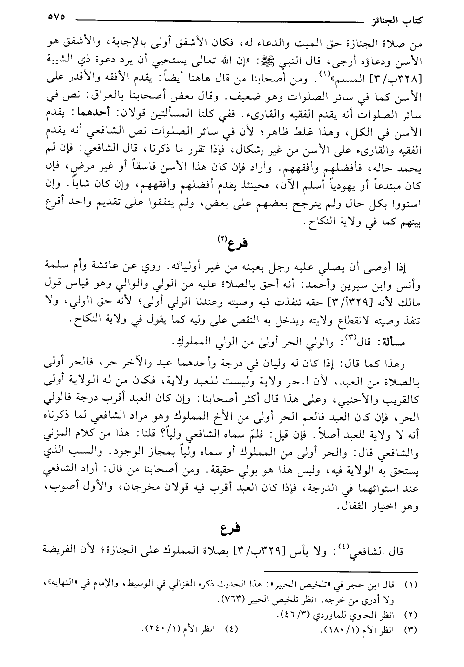 وهذا كما قال: إذا كان له وليان في درجة وأحدهما عبد والأخر حر، فالحر أولى بالصلاة من العبد، لأن للحر ولاية وليست للعبد ولاية، فكان من له الولاية أولى كالقريب والأجنبي، وعلى هذا قال أكثر أصحابنا: وإن كان العبد أقرب درجة فالولي الحر، فإن كان العبد فالعم الحر أولى من الأخ المملوك وهو مراد الشافعي لما ذكرناه أنه لا ولاية للعبد أصلاً. فإن قيل: فلم سماه الشافعي ولياً؟ قلنا: هذا من كلام المزني والشافعي قال: والحر أولى من المملوك أو سماه ولياً بمجاز الوجود. والسبب الذي يستحق به الولاية فيه، وليس هذا هو بولي حقيقة. ومن أصحابنا من قال: أراد الشافعي عند استوائهما في الدرجة، فإذا كان العبد أقرب فيه قولان مخرجان، والأول أصوب، وهو اختيار القفال.